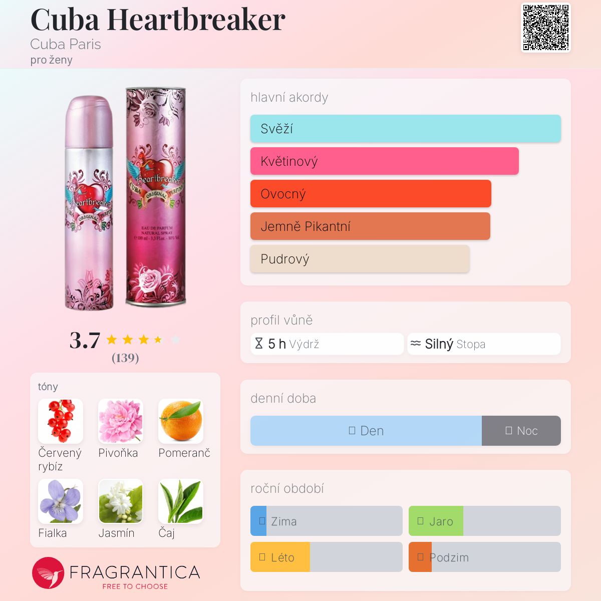 Cuba Heartbreaker podle Cuba Paris je Floral Fruity vůně pro ženy. Vrchní tóny jsou Červený rybíz, Pomeranč a Růžový pepř; střední tóny jsouPivoňka, Fialka, Jasmín a Zelený čaj ; základní tóny jsou Pižmo, Jantar (ambra) a Cedr.