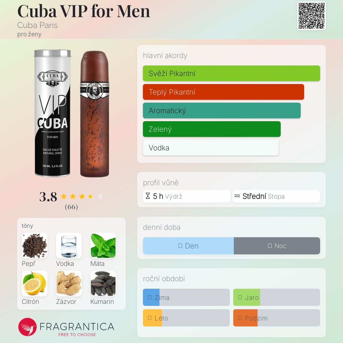Cuba VIP for Men podle Cuba Paris je Aromatic Fruity vůně pro ženy. Cuba VIP for Men byl/a uveden/a v roce 2018. Vrchní tóny jsou Černý pepř, Máta a Citrón; střední tóny jsouVodka, Zázvor a Jablko ; základní tóny jsou Kumarin, Jantar (ambra) a Caesalpinia Leiostachya.