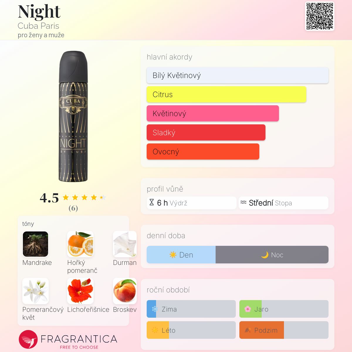 Night podle Cuba Paris je Chypre Fruity vůně pro ženy a muže. Vrchní tóny jsou Hořký pomeranč, Pomerančový květ a Lichořeřišnice; střední tóny jsouDurman, Broskev a Růže ; základní tóny jsou Mandragora, Jantar (ambra) a Vanilka.