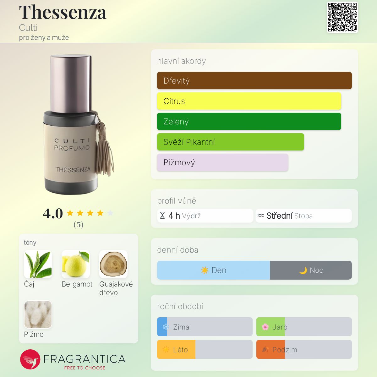 Thessenza podle Culti je Woody Aromatic vůně pro ženy a muže. Vrchní tón je Bergamot ; střední tón jeZelený čaj ; základní tóny jsou Guajakové dřevo a Pižmo.