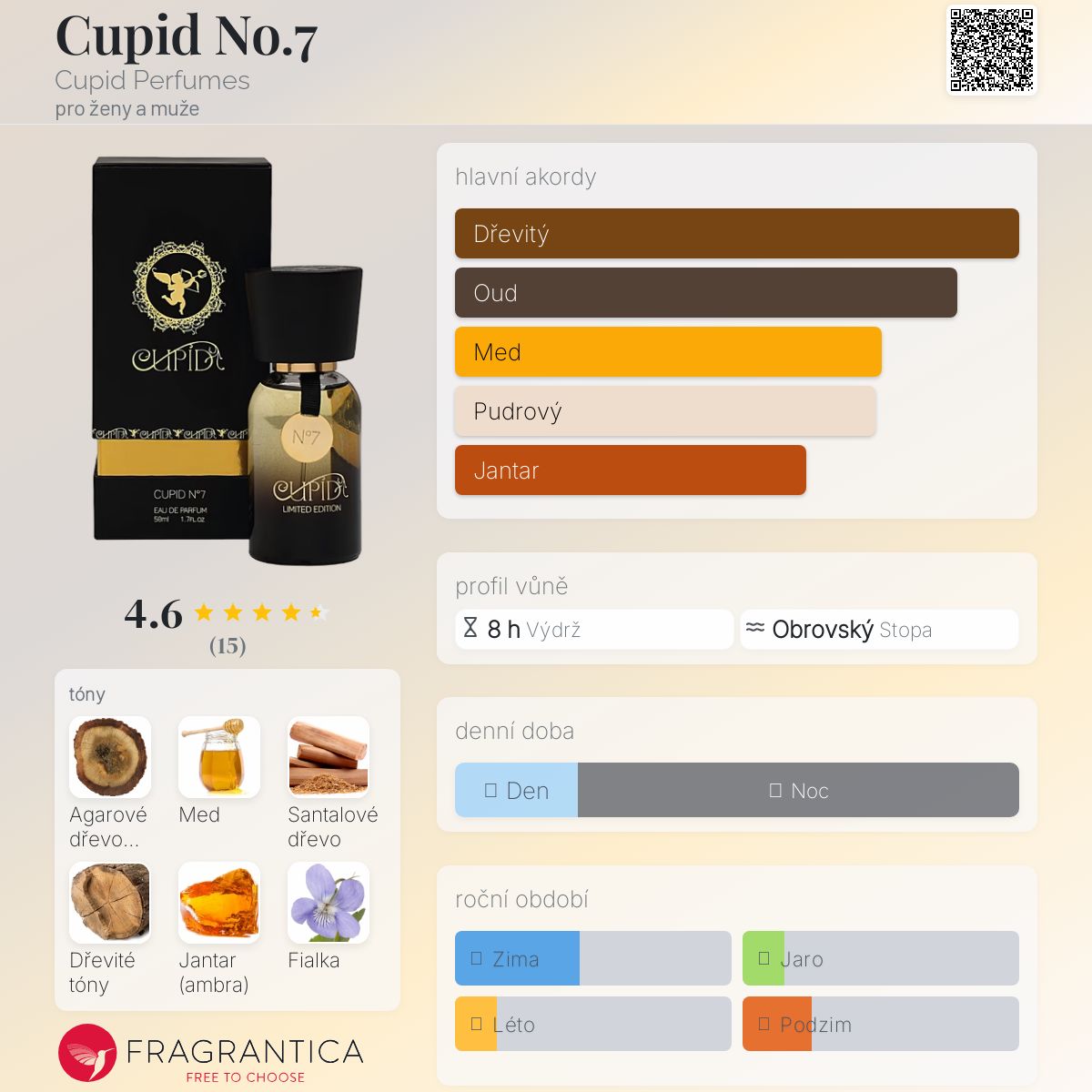 Cupid No.7 podle Cupid Perfumes je Orientální Woody vůně pro ženy a muže. Cupid No.7 byl/a uveden/a v roce 2015. Vrchní tóny jsou Agarové dřevo (oud) a Med; střední tóny jsouSantalové dřevo a Fialka ; základní tóny jsou Dřevité tóny, Jantar (ambra) a Pižmo.