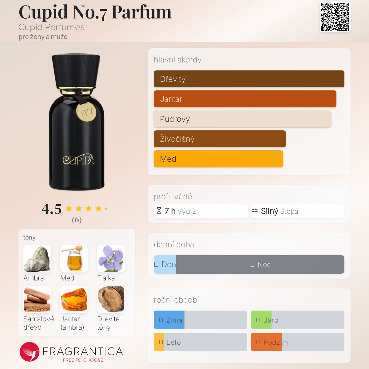 Cupid No.7 Parfum podle Cupid Perfumes je Woody vůně pro ženy a muže. Cupid No.7 Parfum byl/a uveden/a v roce 2023. Vrchní tóny jsou Ambra a Med; střední tóny jsouFialka a Santalové dřevo ; základní tóny jsou Jantar (ambra), Dřevité tóny a Pižmo.