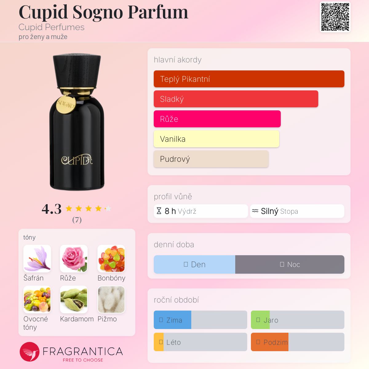 Cupid Sogno Parfum podle Cupid Perfumes je Orientální Spicy vůně pro ženy a muže. Cupid Sogno Parfum byl/a uveden/a v roce 2023. Vrchní tóny jsou Šafrán, Sladké tóny, Ovocné tóny, Kardamom a Skořice; střední tóny jsouRůže, Šlehačka, Santalové dřevo, Cedr a Kosatec ; základní tóny jsou Pižmo, Vanilka a Fazole tonka.