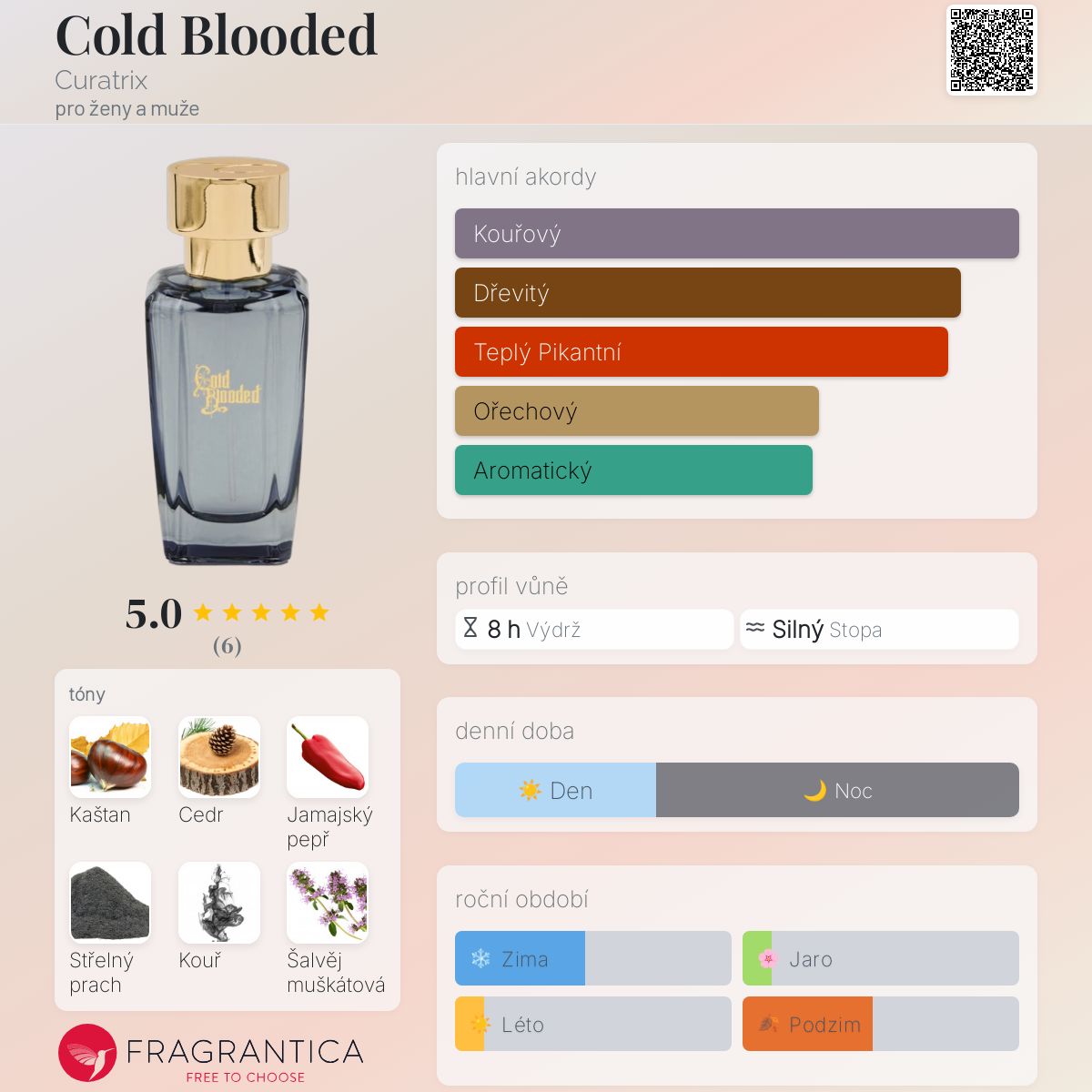 Cold Blooded podle Curatrix je Orientální Woody vůně pro ženy a muže. Toto je nová vůně. Cold Blooded byl/a uveden/a v roce 2024. "Nosem" za touto vůní je Ilias Ermenidis. Vrchní tóny jsou Kaštan, Jamajský pepř, Kouř a Růžový pepř; střední tóny jsouStřelný prach, Šalvěj muškátová a Labdanum ; základní tóny jsou Cedr, Pačuli a Styrax.