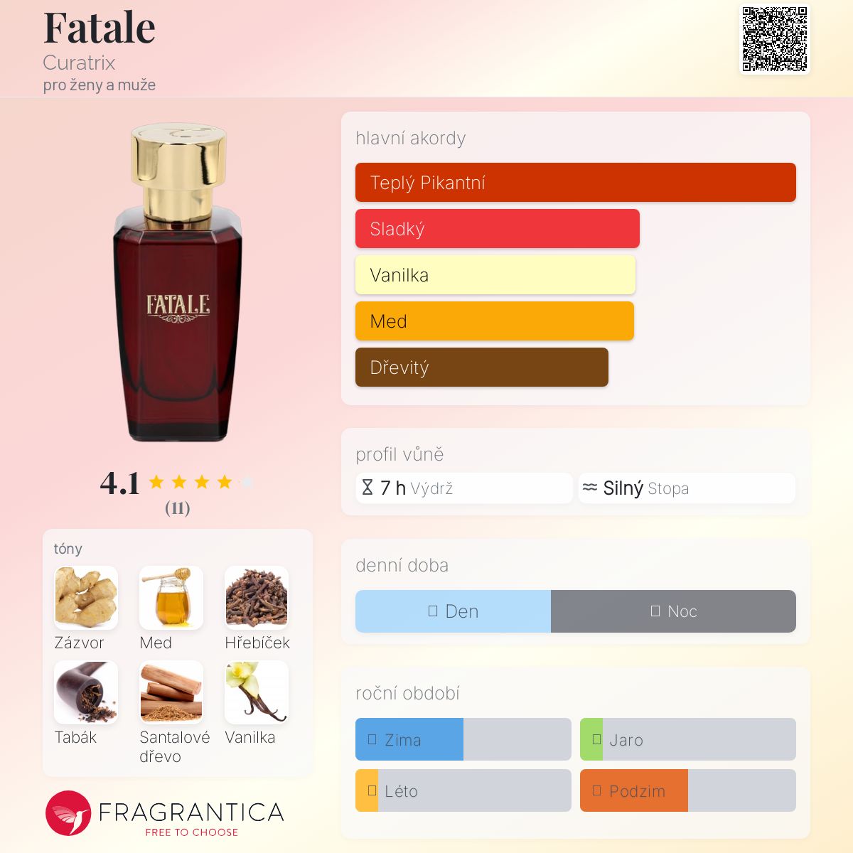 Fatale podle Curatrix je Orientální Vanilla vůně pro ženy a muže. Toto je nová vůně. Fatale byl/a uveden/a v roce 2024. Fatale byl/a vytvořen/a Ilias Ermenidis a Hamid Merati-Kashani. Vrchní tóny jsou Zázvor, Med a Hřebíček; střední tóny jsouTabák a Levandule ; základní tóny jsou Santalové dřevo, Vanilka a Benzoin.