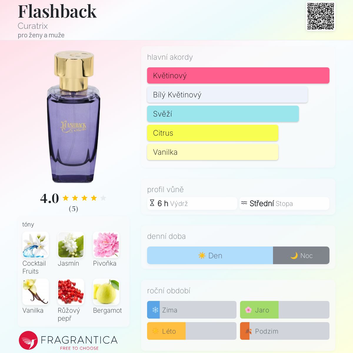 Flashback podle Curatrix je Floral Woody Musk vůně pro ženy a muže. Toto je nová vůně. Flashback byl/a uveden/a v roce 2024. "Nosem" za touto vůní je Frank Voelkl. Vrchní tóny jsou Růžový pepř, Bergamot a Mandarinka; střední tóny jsouVoda z pomerančových květů, Jasmín Sambac a Pivoňka ; základní tóny jsou Vanilka a Mech.