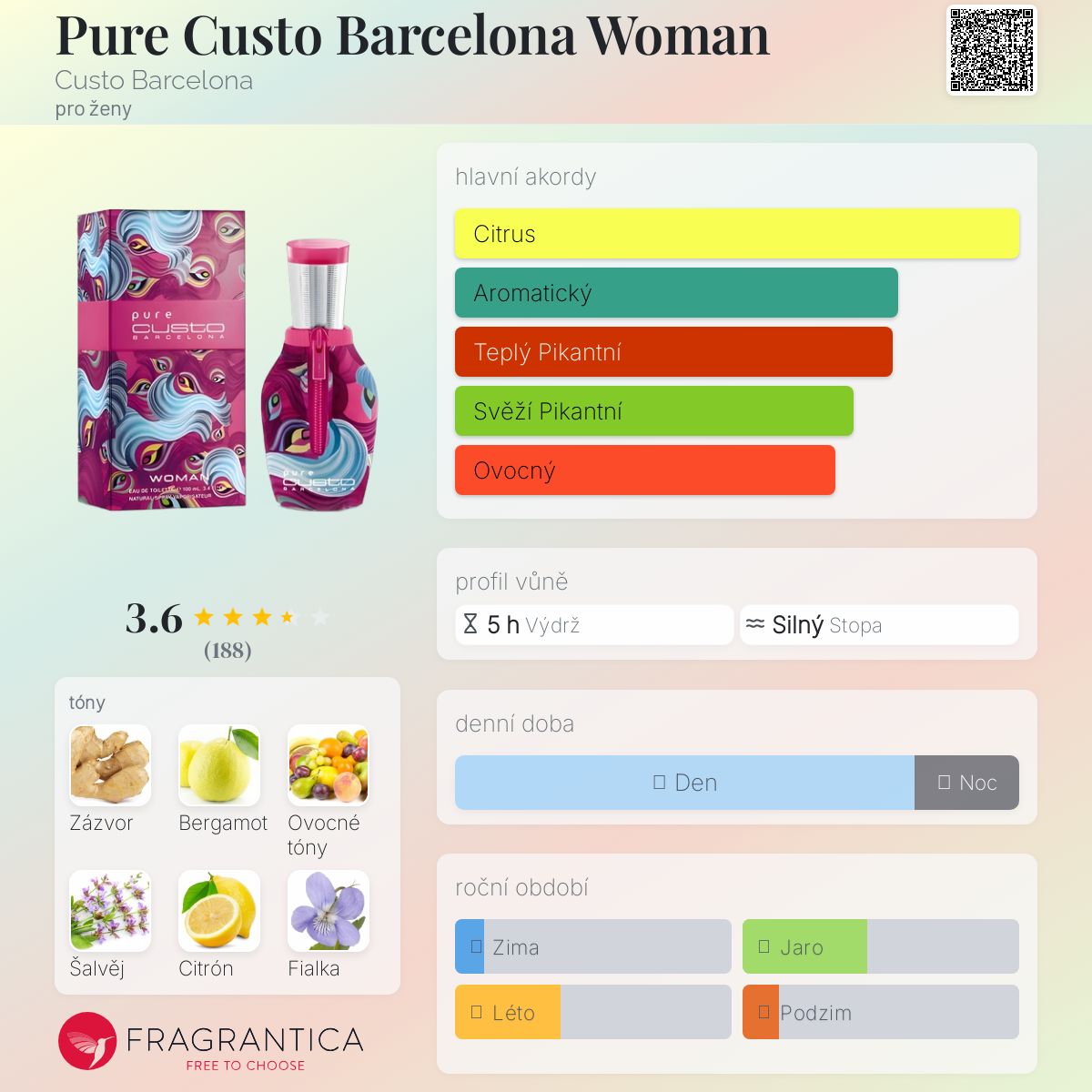 Pure Custo Barcelona Woman podle Custo Barcelona je Floral Fruity vůně pro ženy. Pure Custo Barcelona Woman byl/a uveden/a v roce 2010. Vrchní tóny jsou Zázvor, Bergamot, Šalvěj a Citron amalfi; střední tóny jsouOvocné tóny, Fialka a Pepř ; základní tóny jsou Dřevité tóny, Pižmo a Vanilka.