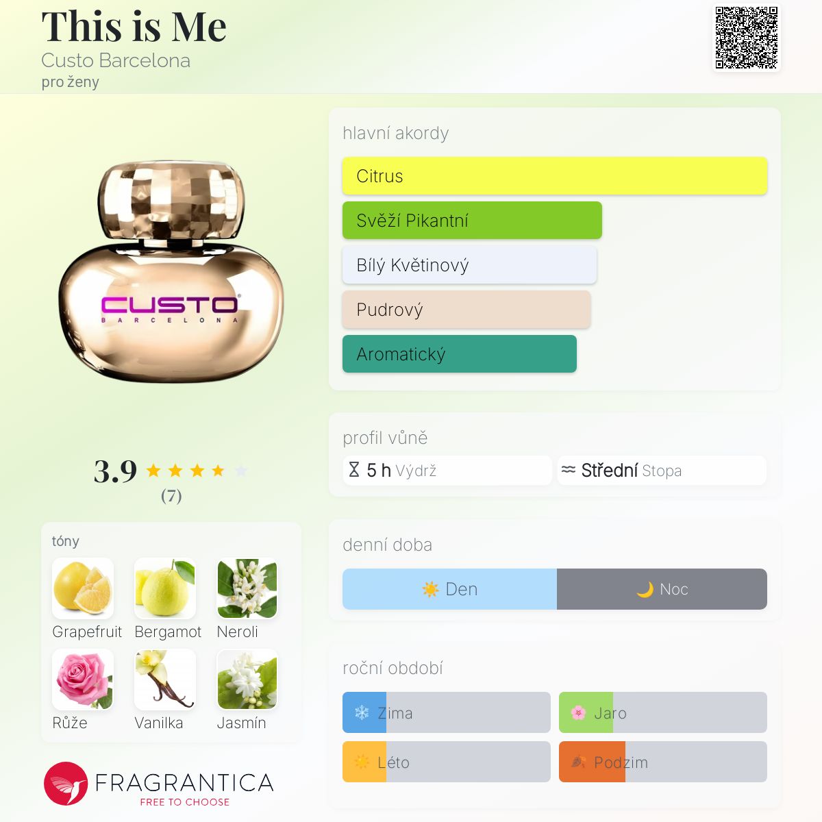 This is Me podle Custo Barcelona je vůně pro ženy. Vrchní tóny jsou Růžový grapefruit, Bergamot a Neroli; střední tóny jsouBulharská růže, Vanilka a Jasmín ; základní tóny jsou Santalové dřevo, Bílé pižmo a Pačuli.