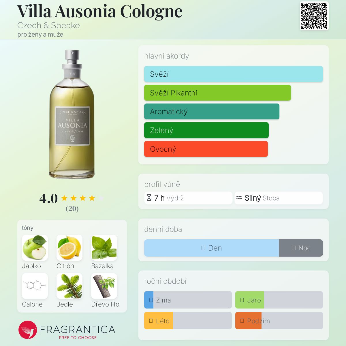 Villa Ausonia Cologne podle Czech & Speake je Citrus vůně pro ženy a muže. Villa Ausonia Cologne byl/a uveden/a v roce 2018. "Nosem" za touto vůní je John Stephen. Vrchní tóny jsou Jablko, Citrón a Bazalka; střední tóny jsouCalone, Jedle a Dřevo Ho ; základní tóny jsou Vanilka a Pižmo.