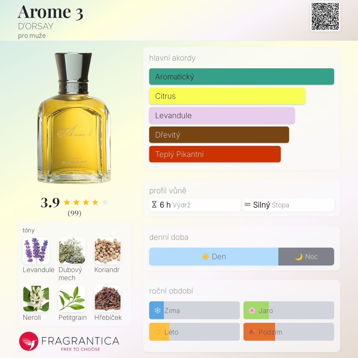 Arome 3 podle D’ORSAY je Woody Floral Musk vůně pro muže. Arome 3 byl/a uveden/a v roce 1943. Vrchní tóny jsou Levandule, Neroli, Petitgrain, Bergamot a Pomeranč; střední tóny jsouLevandule, Koriandr, Hřebíček, Ylang-Ylang, Koření, Šalvěj, Myrha a Jasmín ; základní tóny jsou Dubový mech, Jantar (ambra), Vanilka, Dřevité tóny, Orris, Cedr a Fazole tonka.