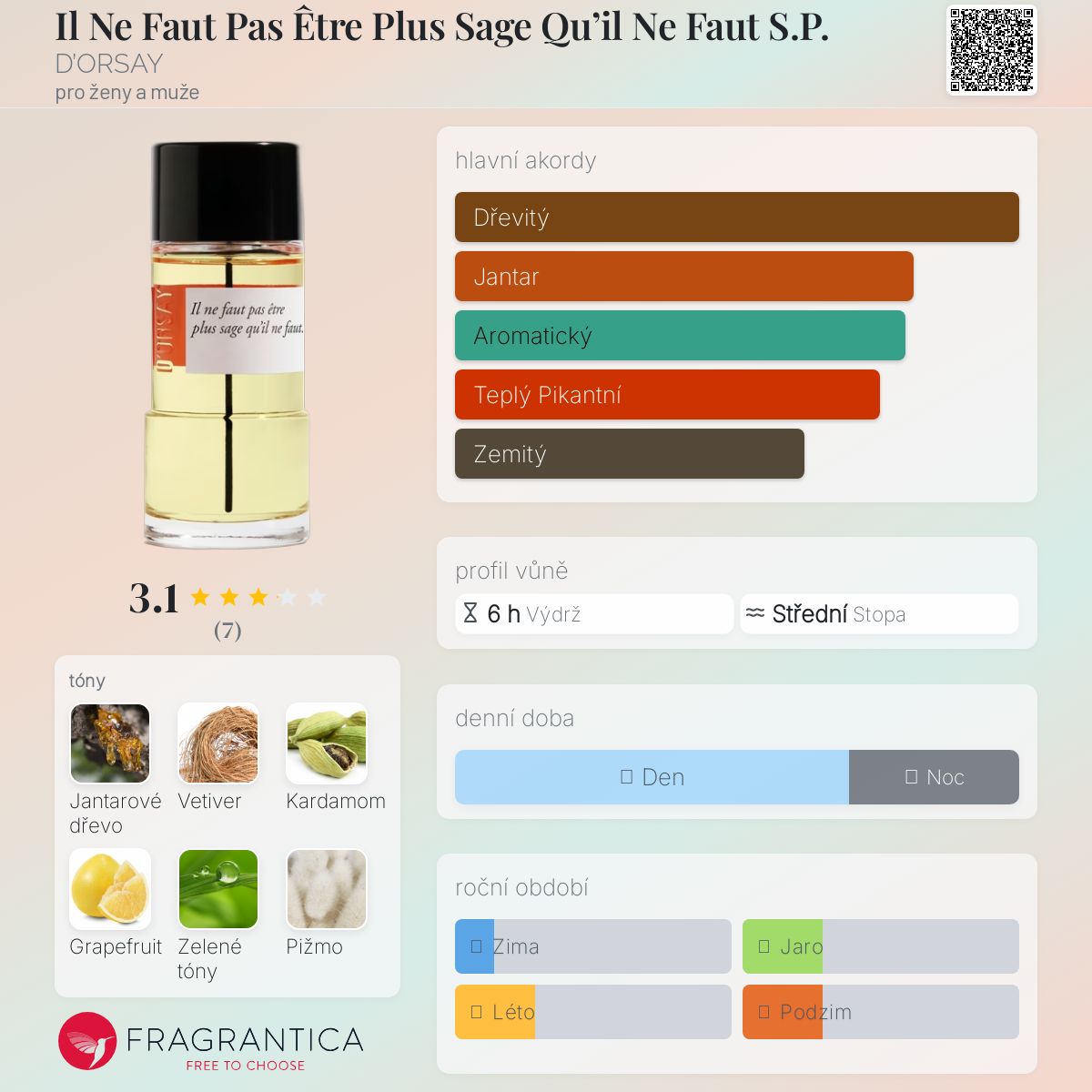 Il Ne Faut Pas Être Plus Sage Qu’il Ne Faut S.P. podle D’ORSAY je Aromatic Fruity vůně pro ženy a muže. Il Ne Faut Pas Être Plus Sage Qu’il Ne Faut S.P. byl/a uveden/a v roce 2020. Vrchní tóny jsou Kardamom a Grapefruit; střední tóny jsouZelené tóny a Fík ; základní tóny jsou Jantarové dřevo, Vetiver a Pižmo.