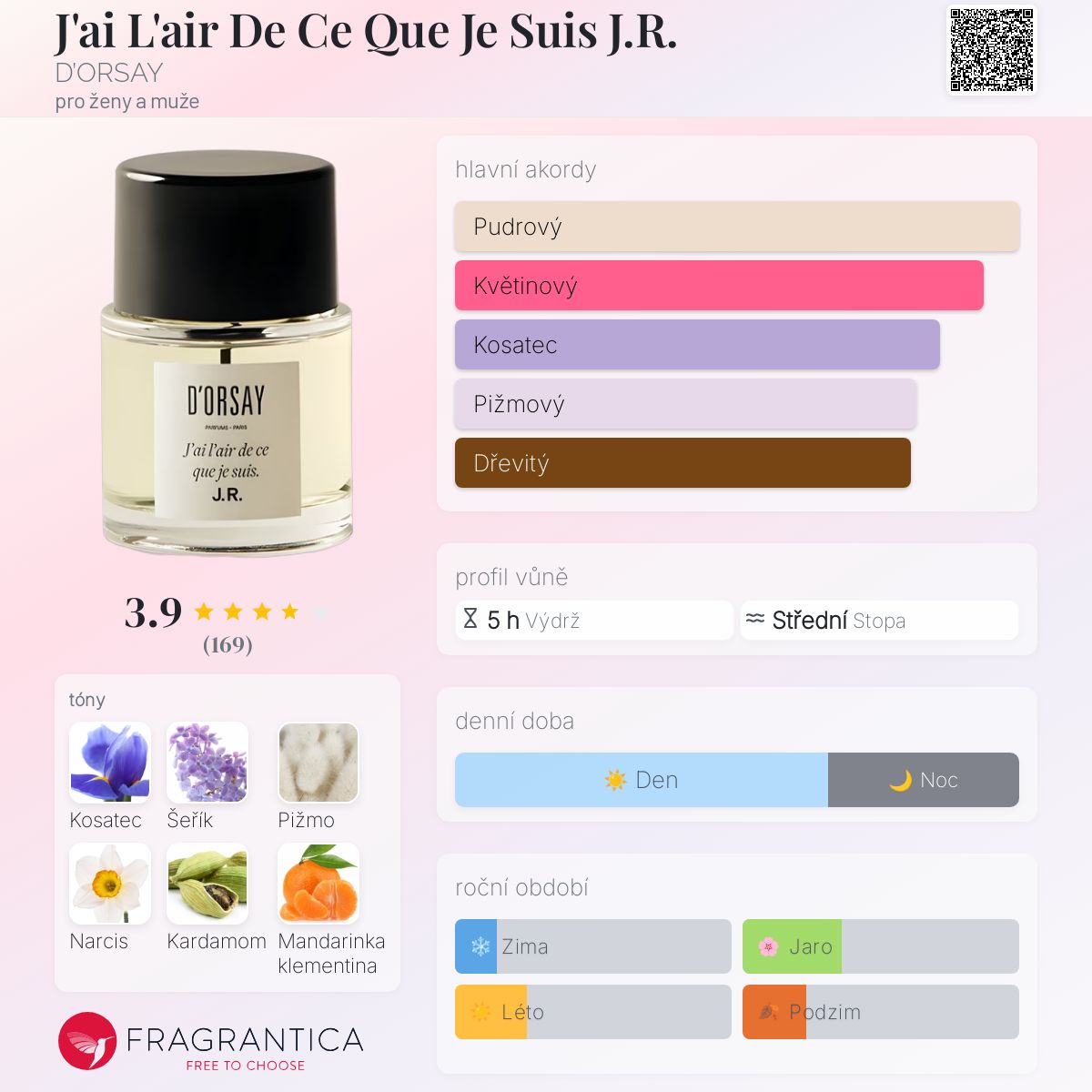 J'ai L'air De Ce Que Je Suis J.R. podle D’ORSAY je Woody vůně pro ženy a muže. J'ai L'air De Ce Que Je Suis J.R. byl/a uveden/a v roce 2020. "Nosem" za touto vůní je Karine Chevallier. Vrchní tóny jsou Kardamom, Mandarinka klementina a Grapefruit; střední tóny jsouŠeřík a Kosatec ; základní tóny jsou Pižmo, Narcis, Santalové dřevo a Cedr.