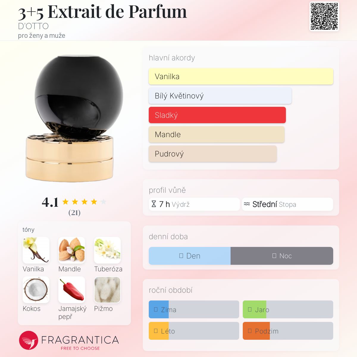 3+5 Extrait de Parfum podle D'OTTO je Orientální Floral vůně pro ženy a muže. 3+5 Extrait de Parfum byl/a uveden/a v roce 2022. "Nosem" za touto vůní je Paolo Terenzi. Vrchní tóny jsou Mandle, Tuberóza, Kokos, Jamajský pepř a Meruňka; střední tóny jsouTuberóza, Jasmín Sambac, Růže a Konvalinka ; základní tóny jsou Vanilkový květ, Pižmo, Santalové dřevo, Dubový mech a Ambra.