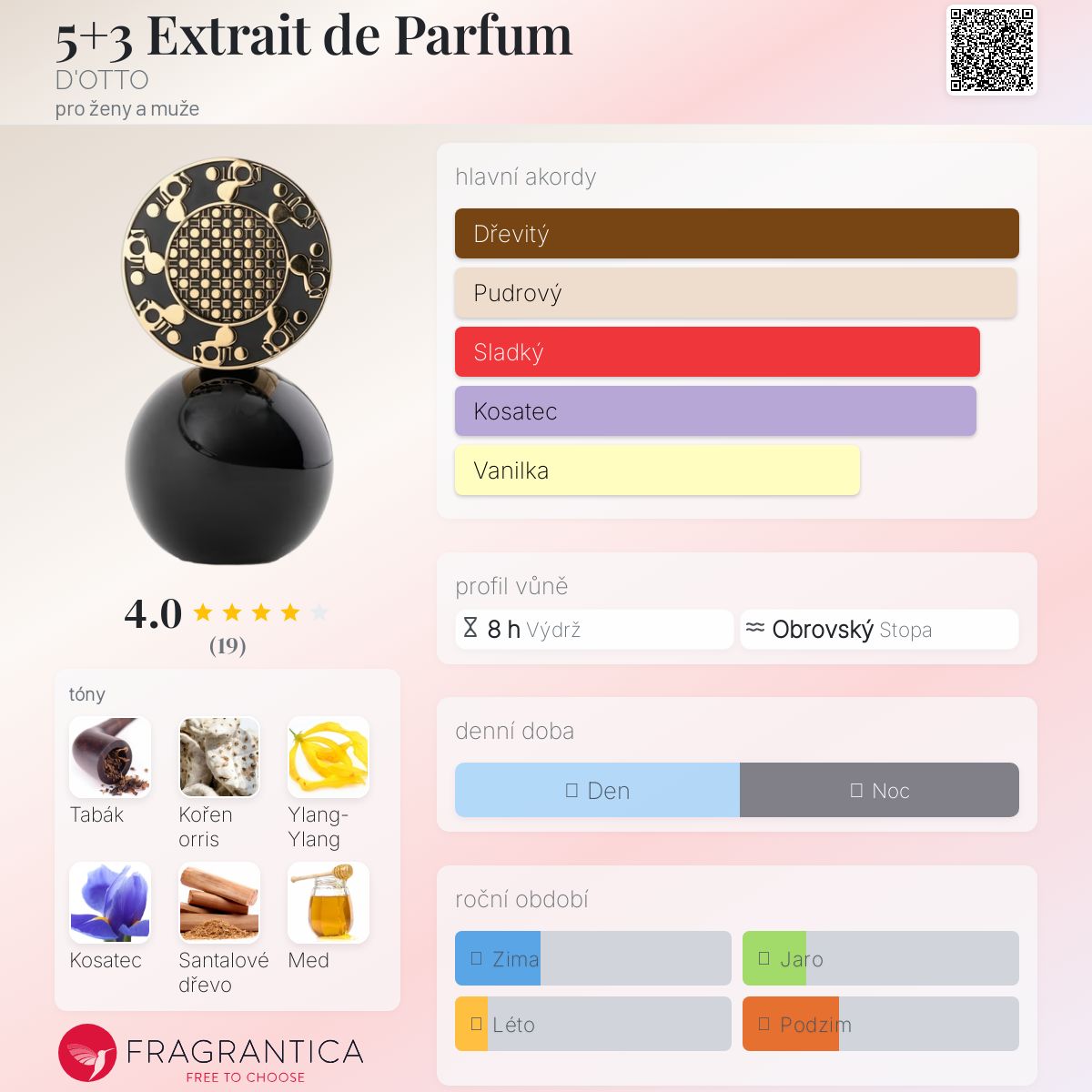 5+3 Extrait de Parfum podle D'OTTO je Orientální Floral vůně pro ženy a muže. 5+3 Extrait de Parfum byl/a uveden/a v roce 2022. "Nosem" za touto vůní je Paolo Terenzi. Vrchní tóny jsou Tabák, Orris, Bílý kosatec, Santalové dřevo a Med; střední tóny jsouYlang-Ylang, Pačuli, Olibanum, Bulharská růže, Magnólie a Tuberóza ; základní tóny jsou Pižmo, Fazole tonka, Vanilkový lusk, Bříza, Ambra a Agarové dřevo (oud).