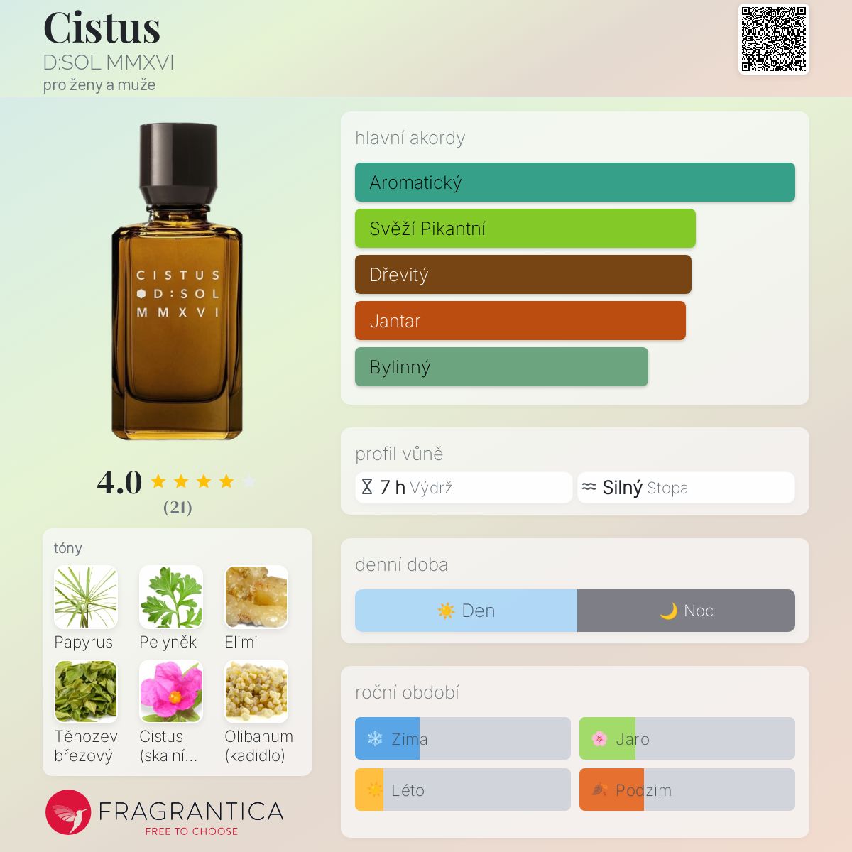 Cistus podle D:SOL MMXVI je Orientální Fougere vůně pro ženy a muže. Toto je nová vůně. Cistus byl/a uveden/a v roce 2024. "Nosem" za touto vůní je Delphine Thierry. Vrchní tóny jsou Pelyněk, Těhozev březový, Bergamot a Pelargónie; střední tóny jsouElimi, Skalní růže a Turecká růže ; základní tóny jsou Papyrus, Kadidlo, Skalní růže a Ambra.