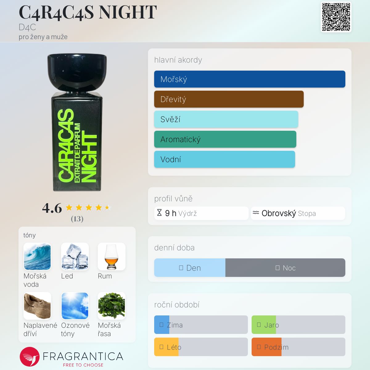 C4R4C4S NIGHT podle D4C je Aromatic Aquatic vůně pro ženy a muže. Toto je nová vůně. C4R4C4S NIGHT byl/a uveden/a v roce 2024. "Nosem" za touto vůní je Daniele Cerroni. Vrchní tóny jsou Mořské tóny, Ozonové tóny, Mořská řasa, Mořská sůl, Šafrán, Limetka a Bergamot; střední tóny jsouLed, Rum, Coca-Cola, Sea Foam, Kovové tóny, Turecká růže a Černý pepř ; základní tóny jsou Naplavené dříví, Jantarové dřevo, Koka, Iso E Super, Ambroxan a Tabák.