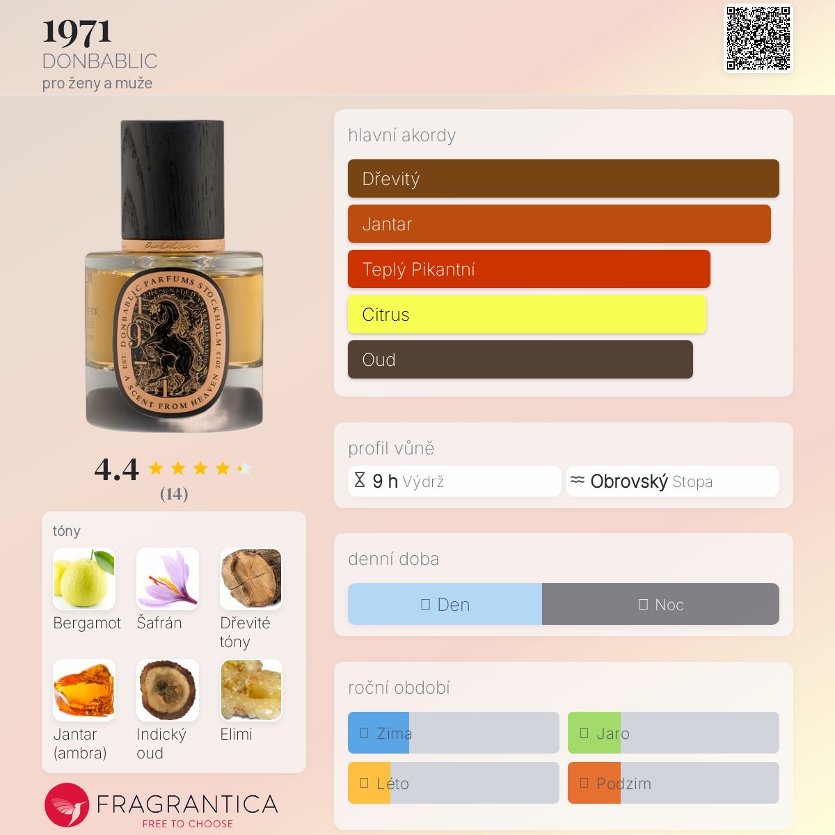 1971 podle DONBABLIC je Woody vůně pro ženy a muže. 1971 byl/a uveden/a v roce 2022. Vrchní tóny jsou Sicilský bergamot, Šafrán a Elimi; střední tóny jsouDřevité tóny, Jantar (ambra) a Bulharská růže ; základní tóny jsou Indický oud, Pryskyřice, List indonéského pačuli a Pižmo.