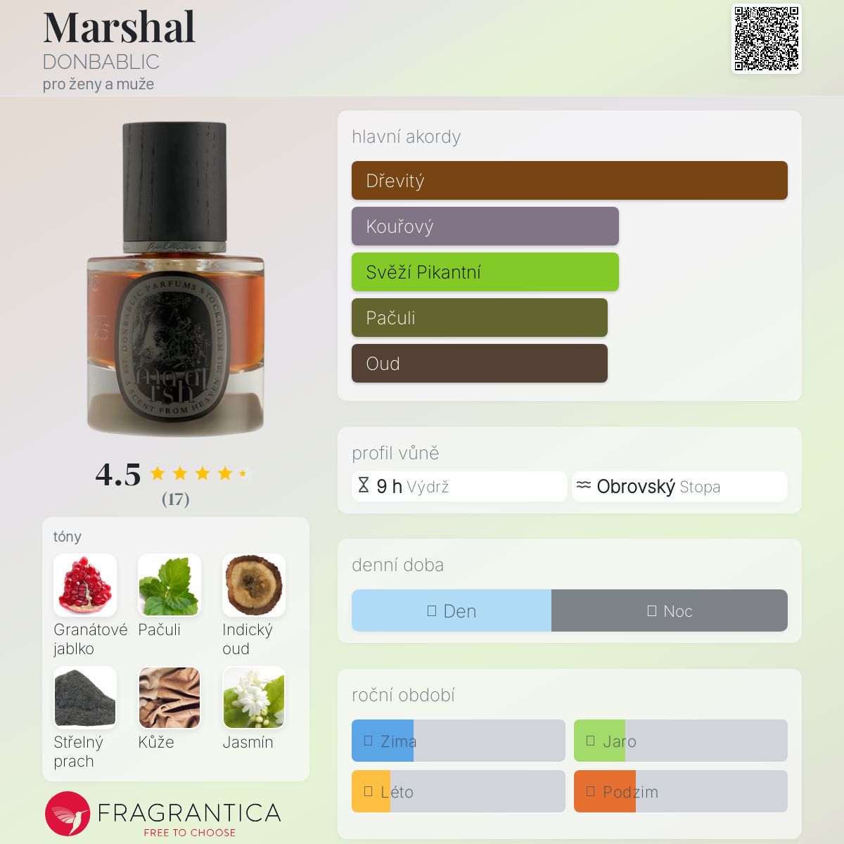Marshal podle DONBABLIC je Leather vůně pro ženy a muže. Marshal byl/a uveden/a v roce 2022. Vrchní tóny jsou Granátové jablko, Střelný prach a Cypřiš; střední tóny jsouPačuli, Kůže, Jasmín a Vetiver ; základní tóny jsou Indický oud, Pižmo, Cedr a Bříza.
