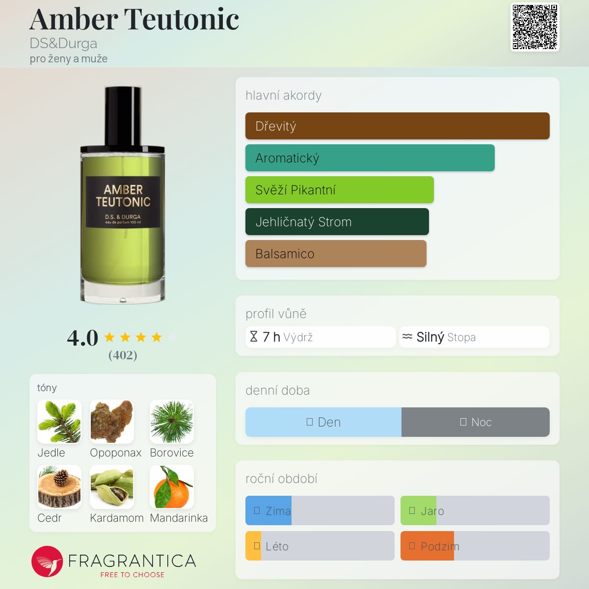 Amber Teutonic podle DS&Durga je Woody Spicy vůně pro ženy a muže. Amber Teutonic byl/a uveden/a v roce 2018. "Nosem" za touto vůní je David Seth Moltz. Vrchní tóny jsou Cedr, Kardamom a Zelená mandarinka; střední tóny jsouJedle bělokorá, Modřín a Pelargónie ; základní tóny jsou Opoponax, Borovice a Pižmo.