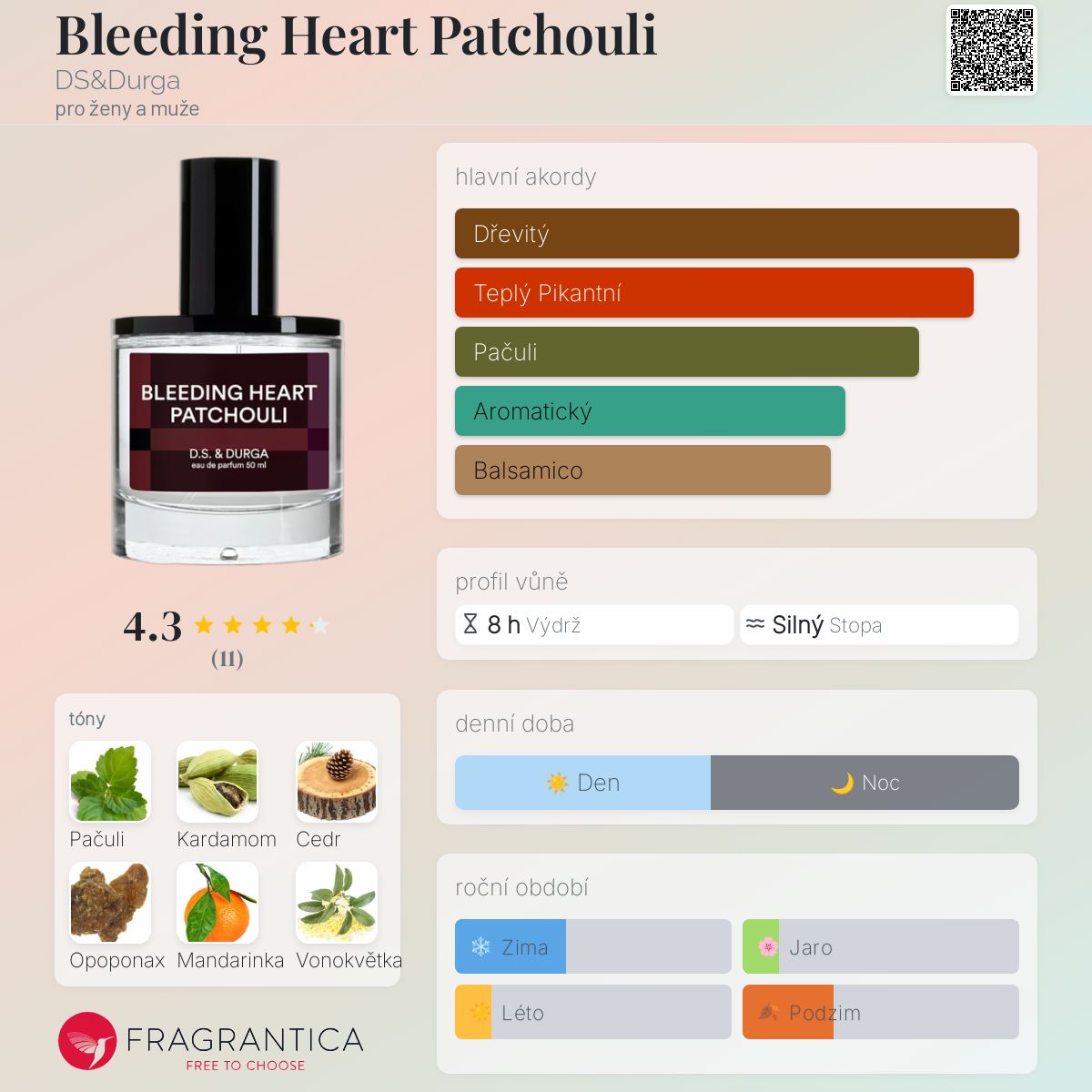 Bleeding Heart Patchouli podle DS&Durga je vůně pro ženy a muže. Bleeding Heart Patchouli byl/a uveden/a v roce 2020. "Nosem" za touto vůní je David Seth Moltz. Vrchní tóny jsou Kardamom, Cedr a Mandarinka; střední tóny jsouVonokvětka, Černý rybíz a Kořen orris ; základní tóny jsou Pačuli, List indonéského pačuli a Opoponax.