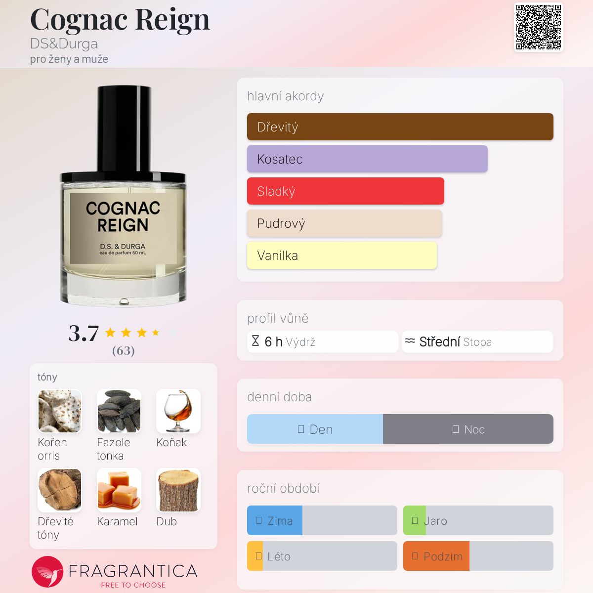 Cognac Reign podle DS&Durga je Woody Spicy vůně pro ženy a muže. Toto je nová vůně. Cognac Reign byl/a uveden/a v roce 2025. "Nosem" za touto vůní je David Seth Moltz. Vrchní tóny jsou Dřevité tóny, Karamel a Bergamot; střední tóny jsouOrris a Koňak ; základní tóny jsou Fazole tonka a Dub.