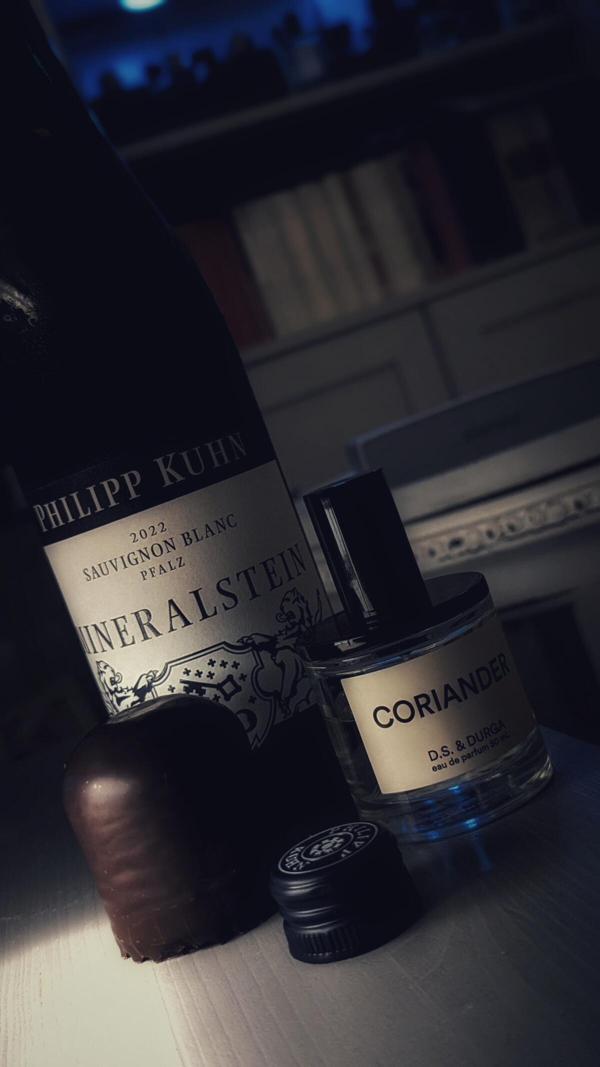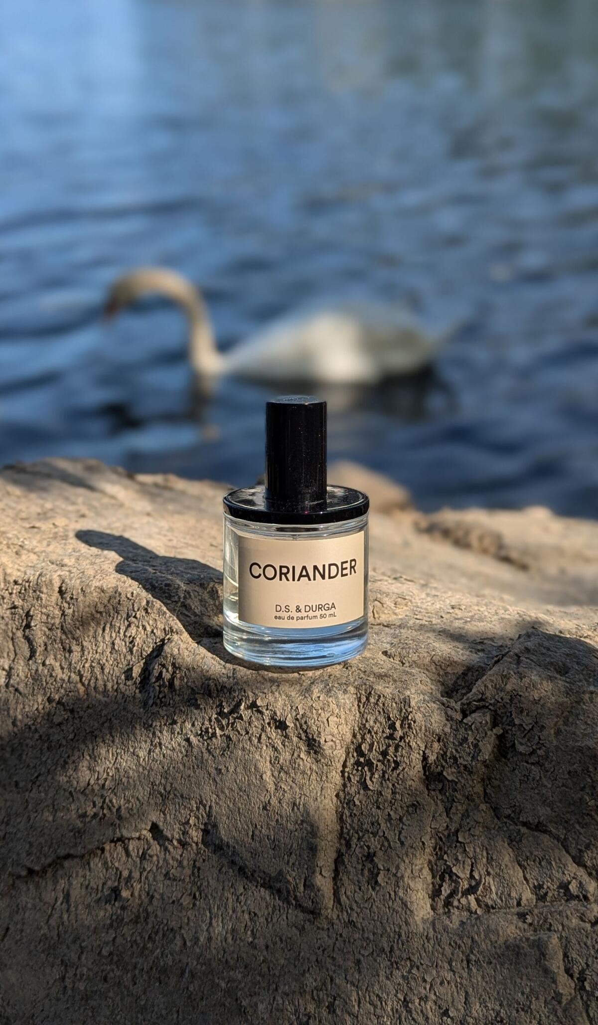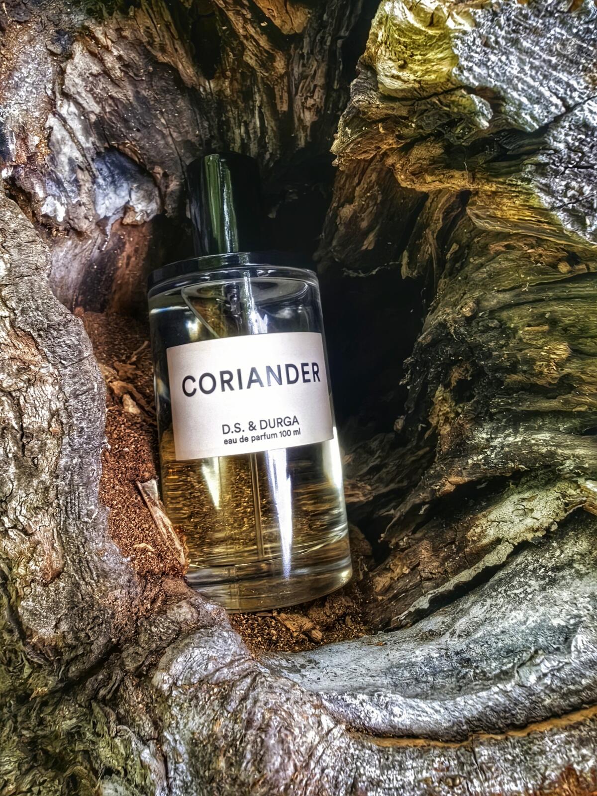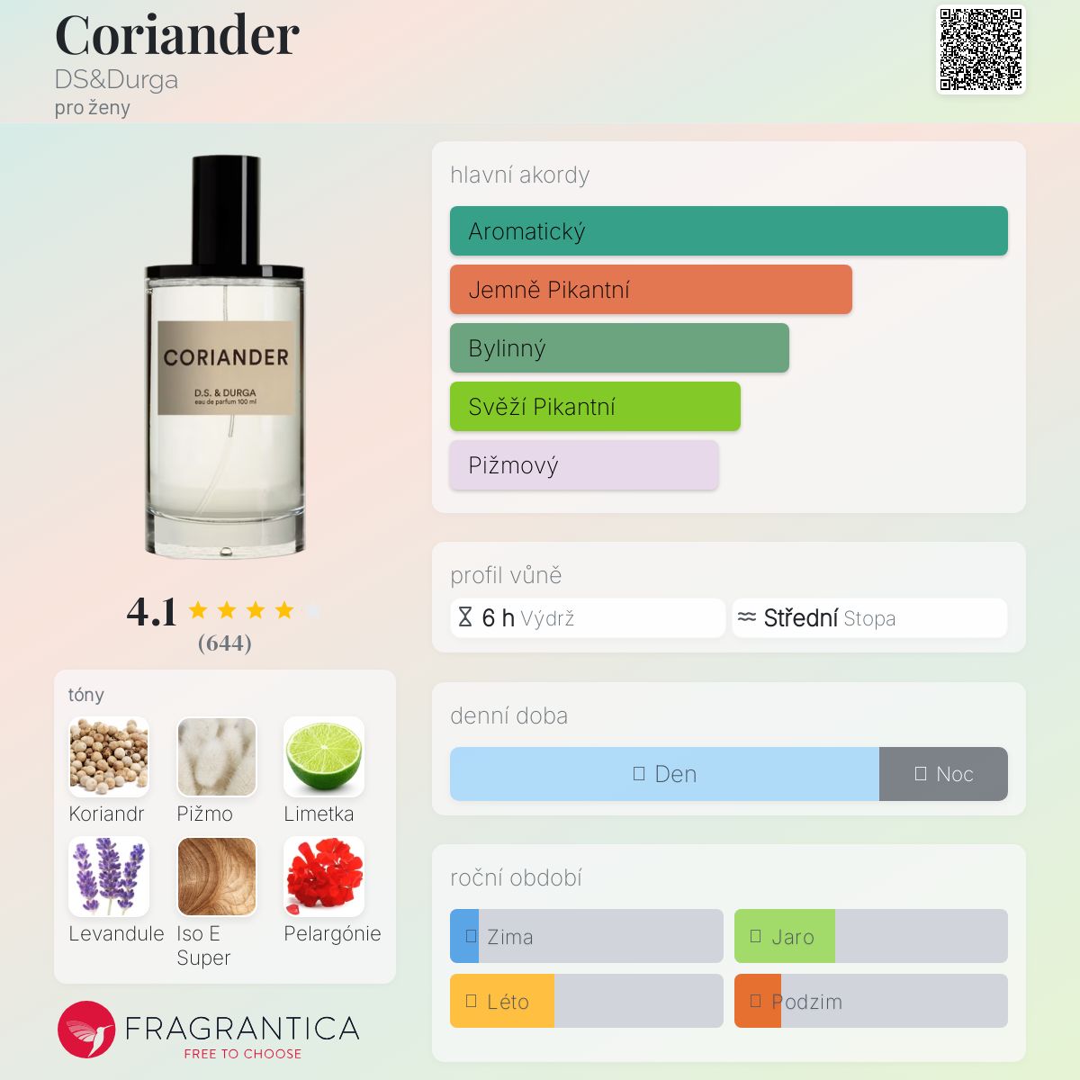 Coriander podle DS&Durga je Aromatic Spicy vůně pro ženy. "Nosem" za touto vůní je David Seth Moltz. Vrchní tóny jsou Koriandr, Limetka, Rozmarýn, Jalovec a Pepř; střední tóny jsouLevandule, Iso E Super, Pelargónie, Šalvěj muškátová a Hřebíček ; základní tóny jsou Pižmo, Muškátový květ a Magnólie.