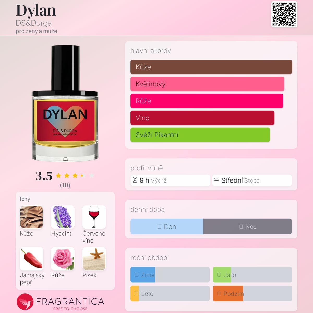 Dylan podle DS&Durga je Orientální Floral vůně pro ženy a muže. Dylan byl/a uveden/a v roce 2021. "Nosem" za touto vůní je David Seth Moltz. Vrchní tóny jsou Červené víno, Červená chilli paprička a Tymián; střední tóny jsouHyacint a Růže ; základní tóny jsou Kůže a Písek.