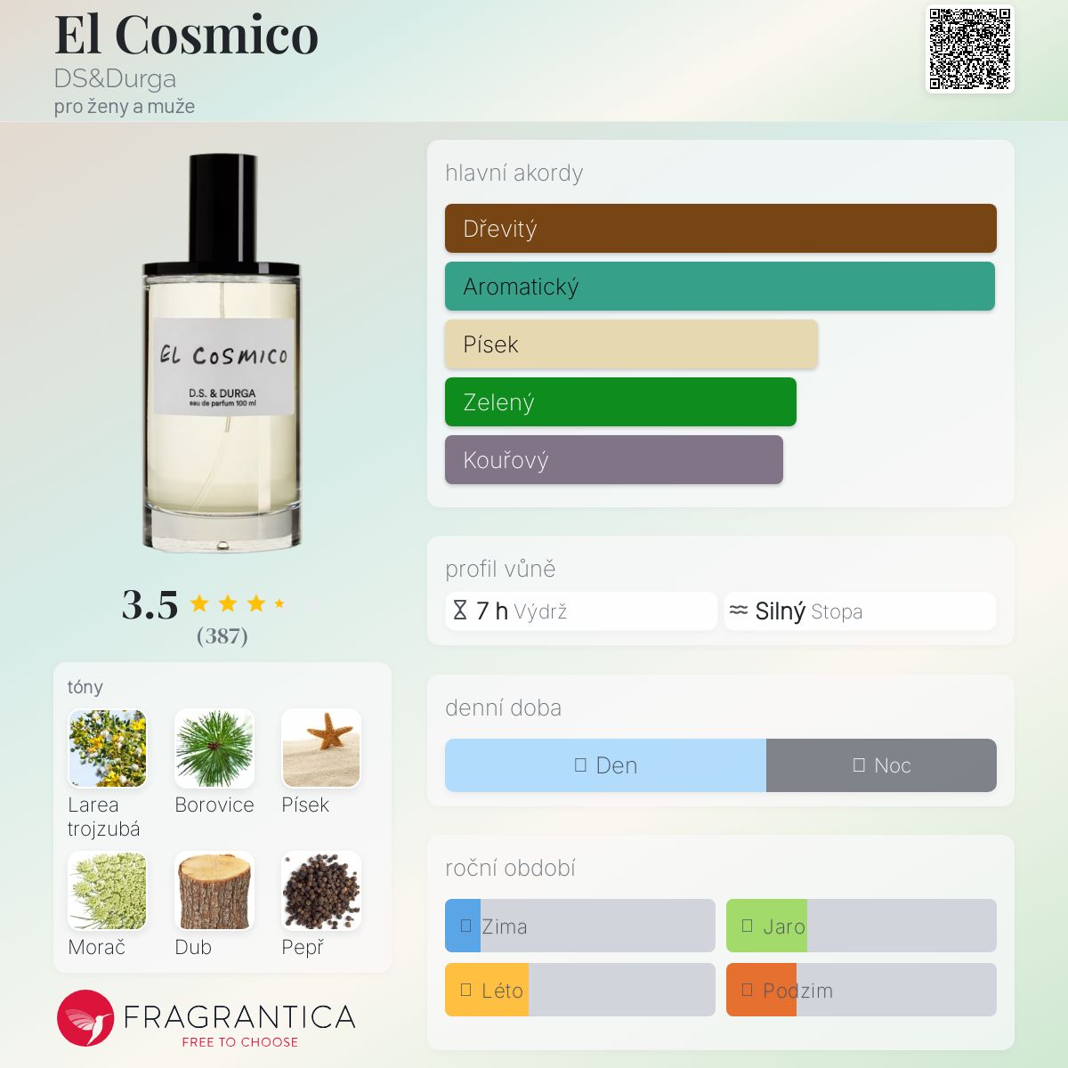 El Cosmico podle DS&Durga je Woody vůně pro ženy a muže. El Cosmico byl/a uveden/a v roce 2015. El Cosmico byl/a vytvořen/a David Seth Moltz a Kavi Moltz. Vrchní tóny jsou Borovice a Pepř; střední tóny jsouLarea trojzubá, Morač a Dub ; základní tóny jsou Písek a Morač.