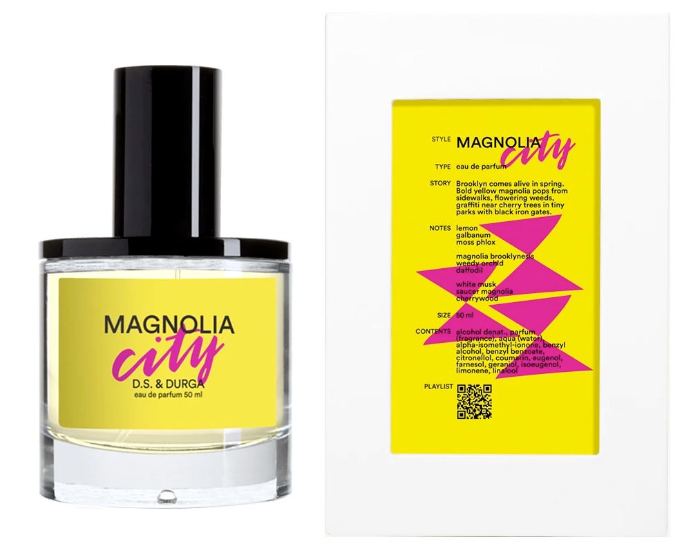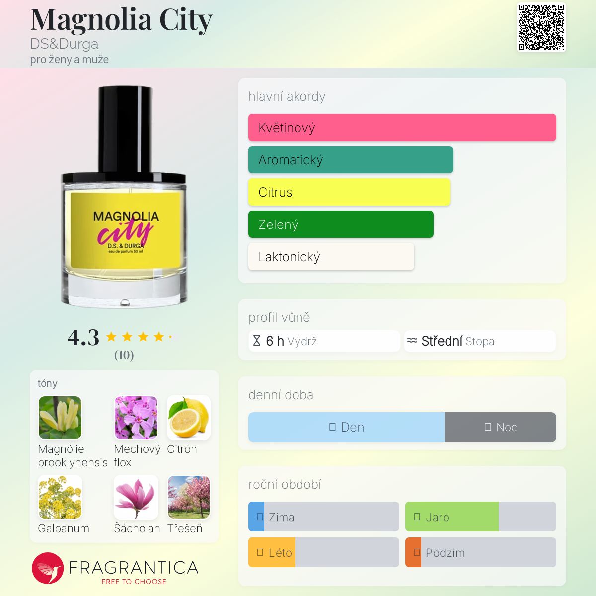 Magnolia City podle DS&Durga je Floral vůně pro ženy a muže. Magnolia City byl/a uveden/a v roce 2021. "Nosem" za touto vůní je David Seth Moltz. Vrchní tóny jsou Mechový flox, Citrón a Galbanum; střední tóny jsouMagnólie brooklynensis, Narcis a Orchidej ; základní tóny jsou Šácholan, Třešeň a Bílé pižmo.