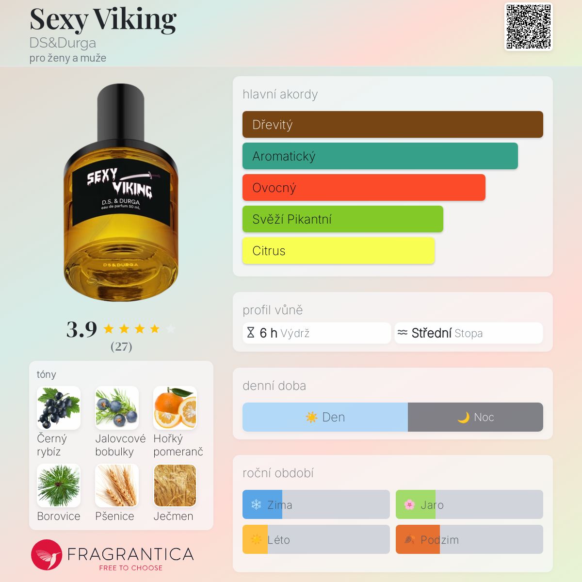 Sexy Viking podle DS&Durga je Orientální Floral vůně pro ženy a muže. Sexy Viking byl/a uveden/a v roce 2022. "Nosem" za touto vůní je David Seth Moltz. Vrchní tóny jsou Černý rybíz, Jalovcové bobulky a Hořký pomeranč; střední tóny jsouBorovice, Pšenice a Růže ; základní tóny jsou Ječmen, Ambra a Dřevité tóny.