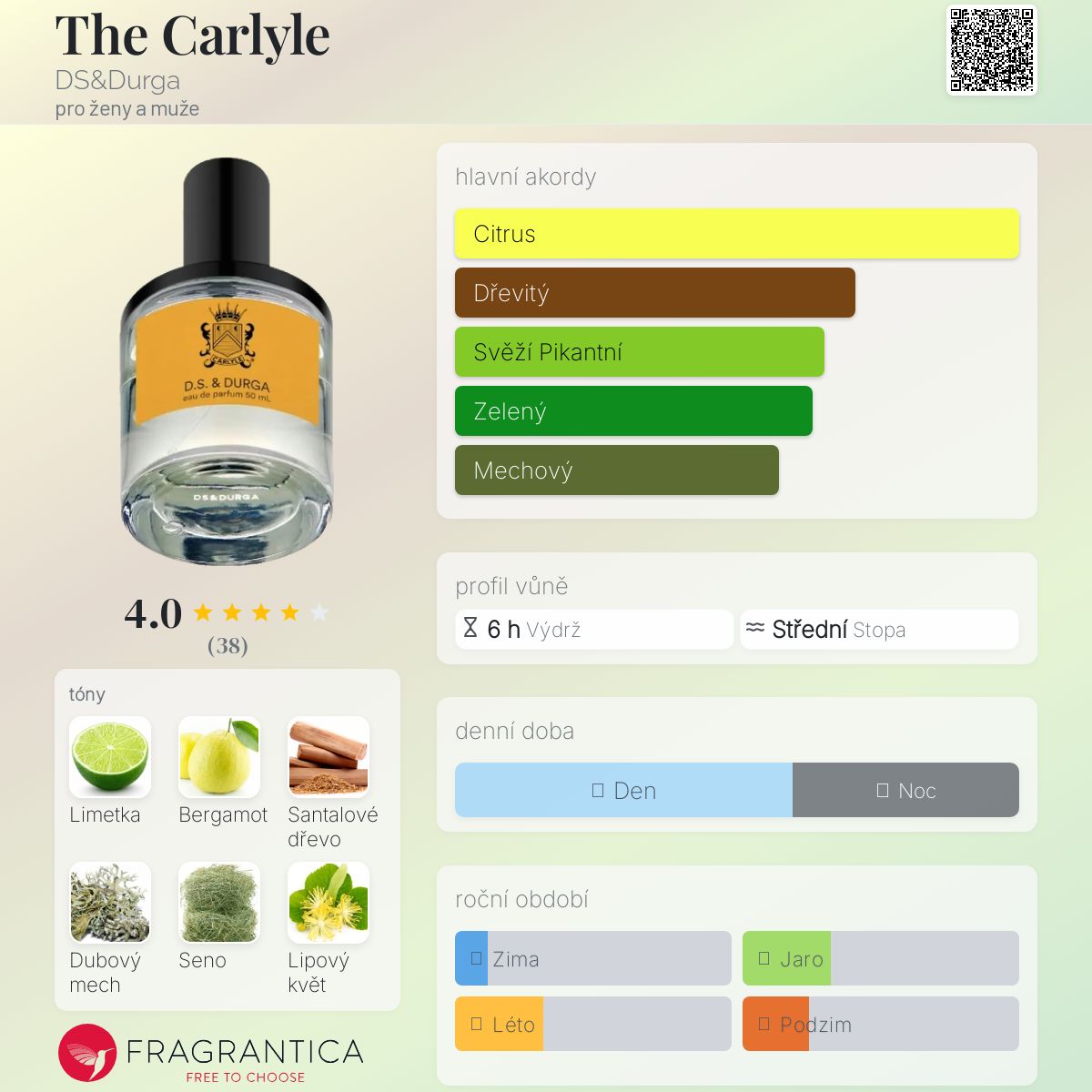 The Carlyle podle DS&Durga je Floral Woody Musk vůně pro ženy a muže. The Carlyle byl/a uveden/a v roce 2023. Vrchní tóny jsou Limetka, Bergamot a Neroli; střední tóny jsouLipový květ, Zimolez a Růže ; základní tóny jsou Santalové dřevo, Mech a Seno.