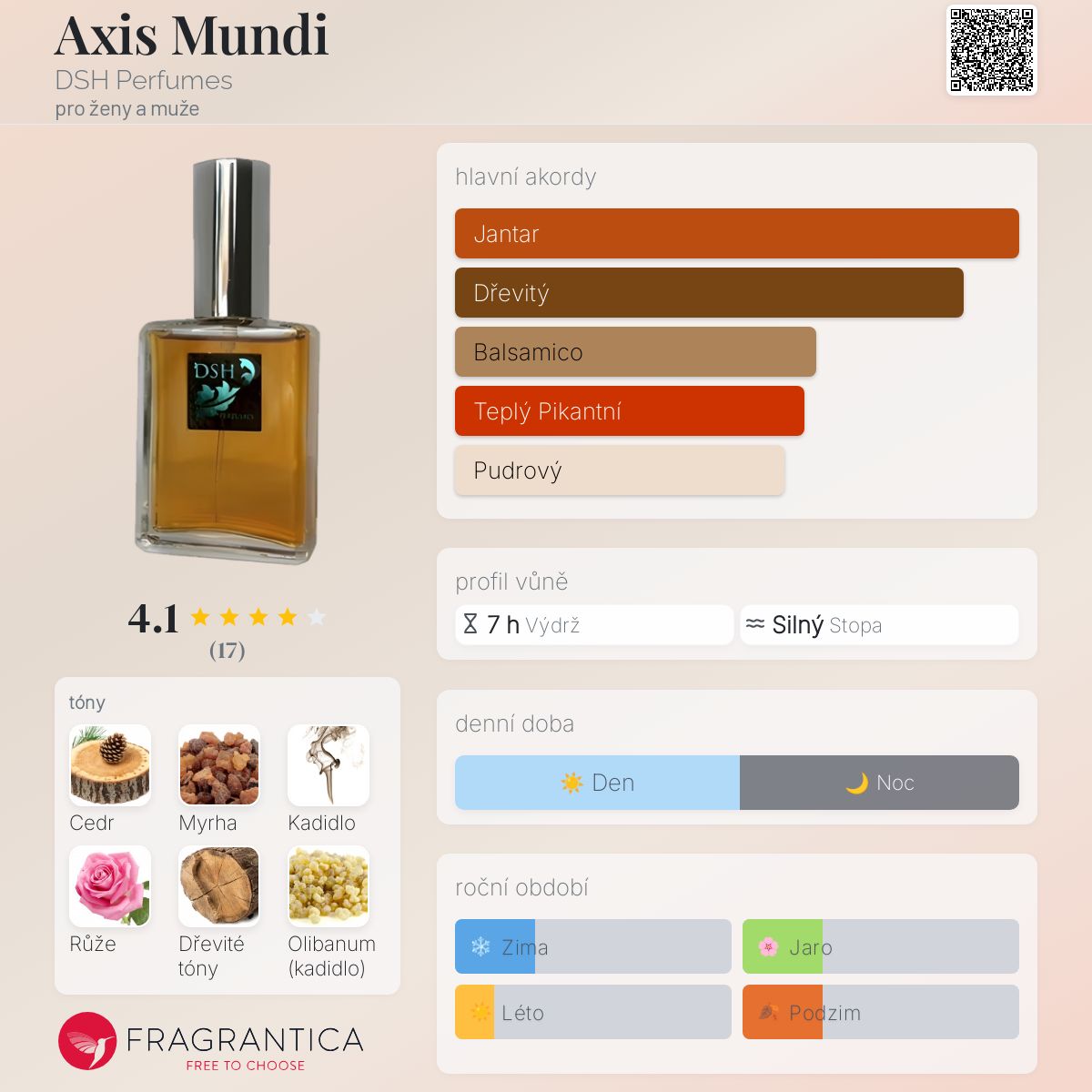 Axis Mundi podle DSH Perfumes je Orientální vůně pro ženy a muže. Axis Mundi byl/a uveden/a v roce 2016. "Nosem" za touto vůní je Dawn Spencer Hurwitz.