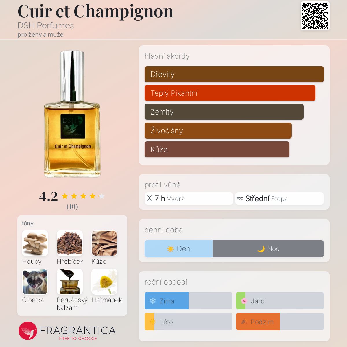Cuir et Champignon podle DSH Perfumes je Leather vůně pro ženy a muže. Cuir et Champignon byl/a uveden/a v roce 2010. Vrchní tóny jsou Heřmánek, Šalvěj muškátová, Bergamot, Galbanum a Neroli; střední tóny jsouHouby, Hřebíček, Med, Kosatec, Santalové dřevo a Tuberóza ; základní tóny jsou Kůže, Cibetka, Peruánský balzám, Guajakové dřevo, Cedr, Tabák, Kastoreum a Java vetiverový olej.