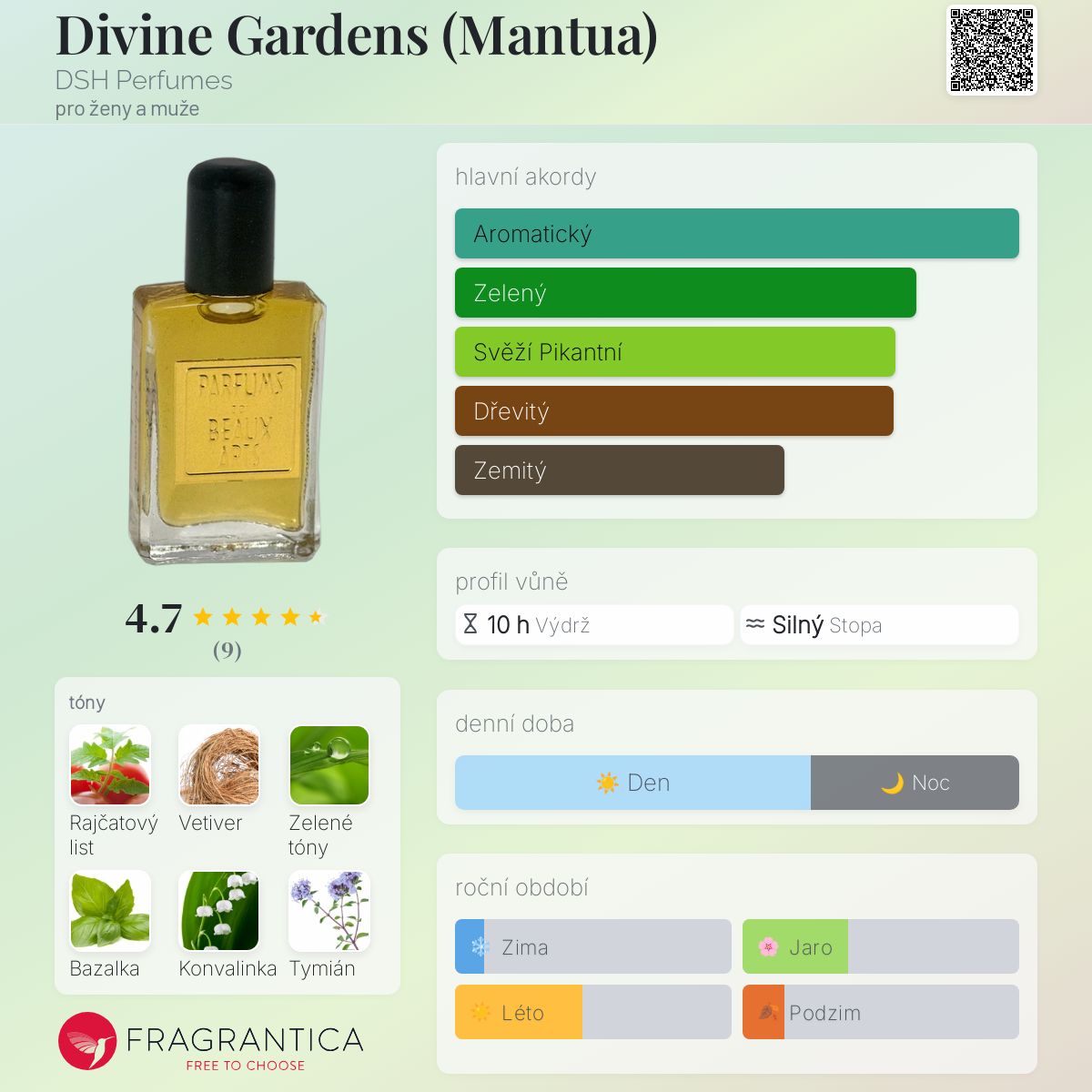 Divine Gardens (Mantua) podle DSH Perfumes je Chypre vůně pro ženy a muže. "Nosem" za touto vůní je Dawn Spencer Hurwitz. Vrchní tóny jsou Rajčatový list, Bylinné tóny, Bazalka, Tymián, Máta, Hořký pomeranč, Zelená mandarinka a Bergamot; střední tóny jsouKonvalinka, Jasmín, Stříbrná borovice, Aksamitník, Jedle balzámová, Bulharská růže a Fialka ; základní tóny jsou Vetiver, Australské santalové dřevo, Kořen orris, Dubový mech, Indické pačuli a Pižmo.