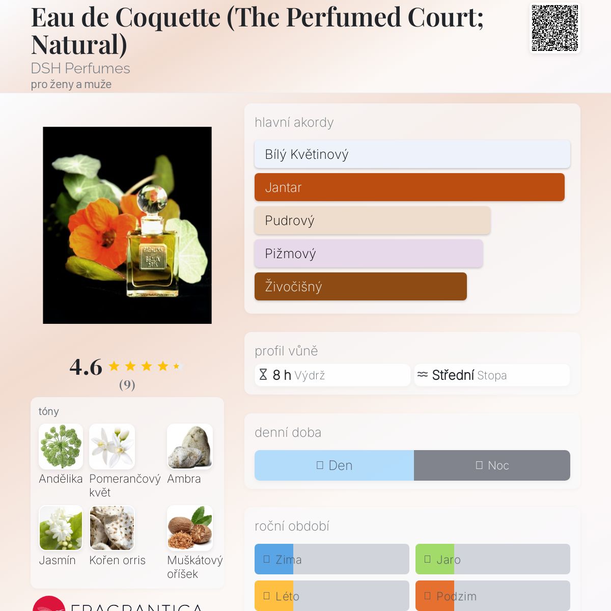 Eau de Coquette (The Perfumed Court; Natural) podle DSH Perfumes je vůně pro ženy a muže. "Nosem" za touto vůní je Dawn Spencer Hurwitz. Vrchní tóny jsou Andělika a Muškátový oříšek; střední tóny jsouKvět afrického pomeranče, Jasmín, Kořen orris a Růže ; základní tón je Ambra.