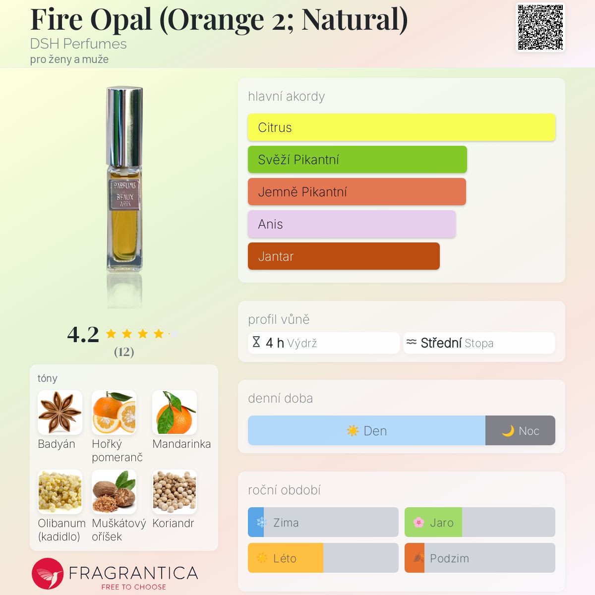 Fire Opal (Orange 2; Natural) podle DSH Perfumes je vůně pro ženy a muže. "Nosem" za touto vůní je Dawn Spencer Hurwitz. Vrchní tóny jsou Badyán, Hořký pomeranč a Koriandr; střední tóny jsouMandarinka, Muškátový oříšek, Krvavý pomeranč a Hřebíček ; základní tóny jsou Olibanum a Brazilské růžové dřevo.