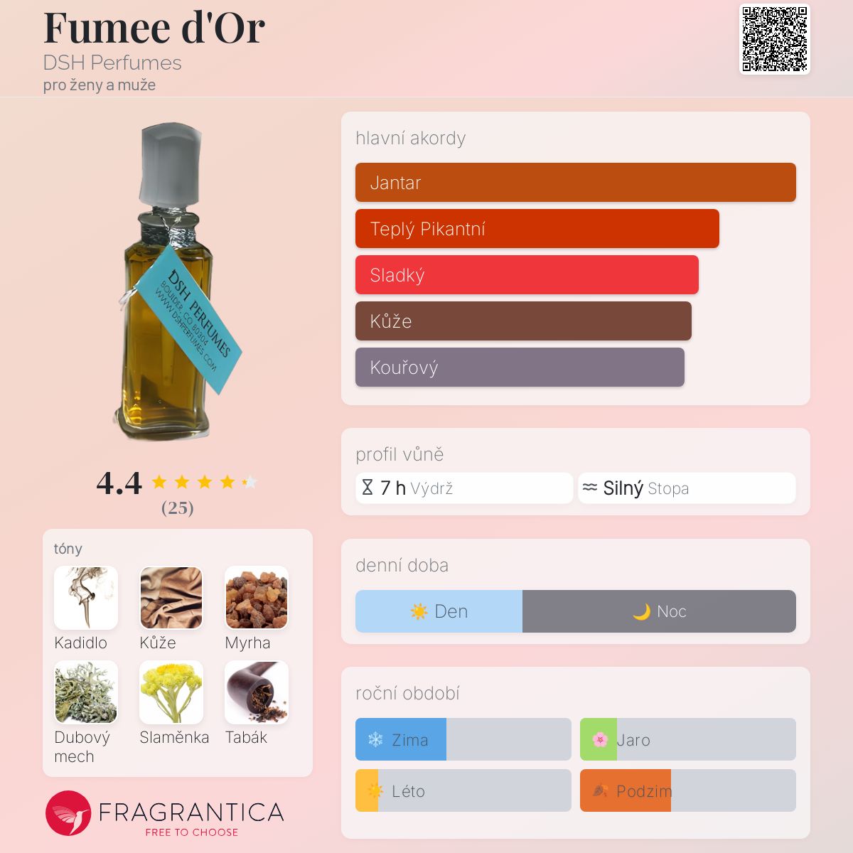 Fumee d'Or podle DSH Perfumes je Floral Woody Musk vůně pro ženy a muže. Fumee d'Or byl/a uveden/a v roce 2014. "Nosem" za touto vůní je Dawn Spencer Hurwitz.
