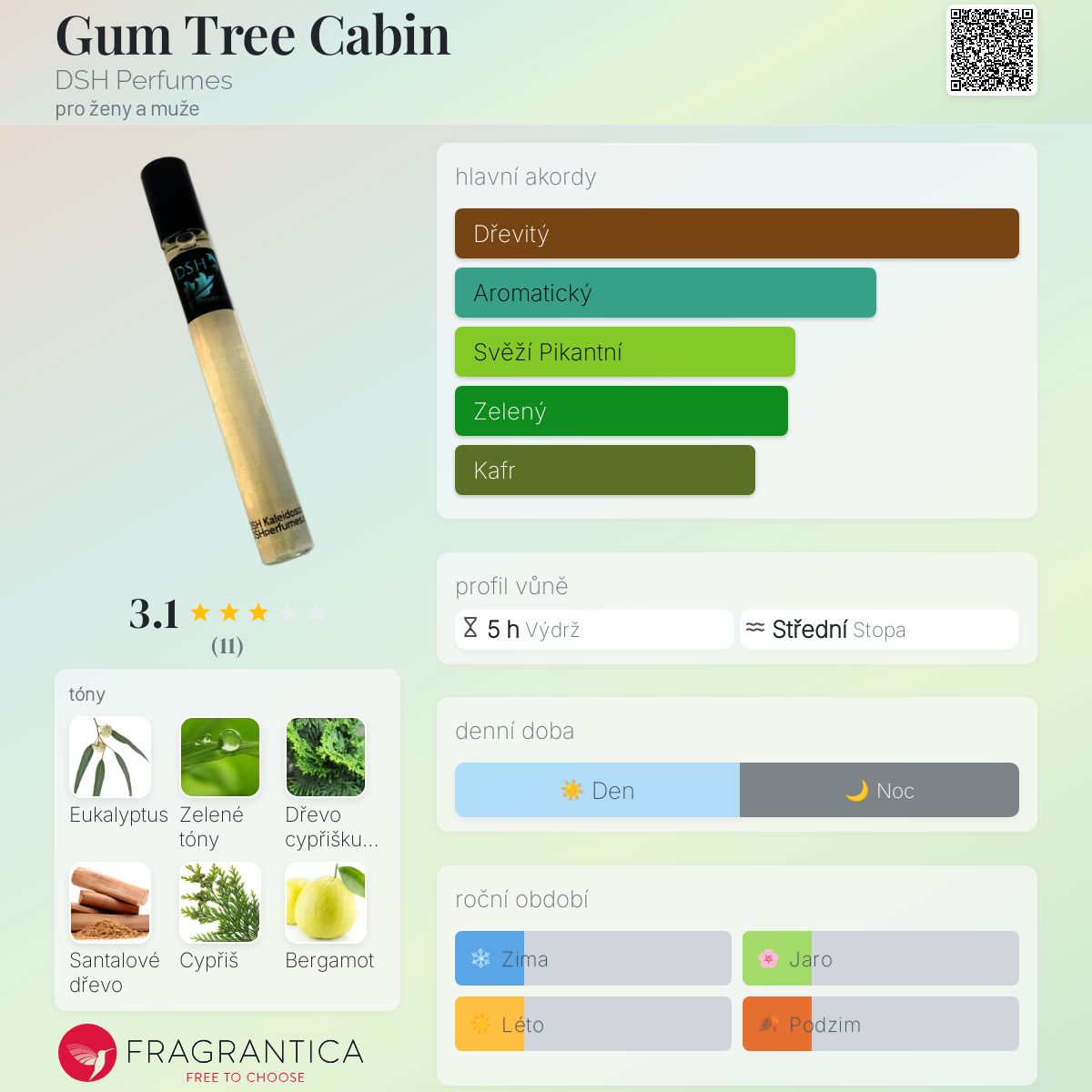 Gum Tree Cabin podle DSH Perfumes je Aromatic Green vůně pro ženy a muže. Gum Tree Cabin byl/a uveden/a v roce 2020. "Nosem" za touto vůní je Dawn Spencer Hurwitz.