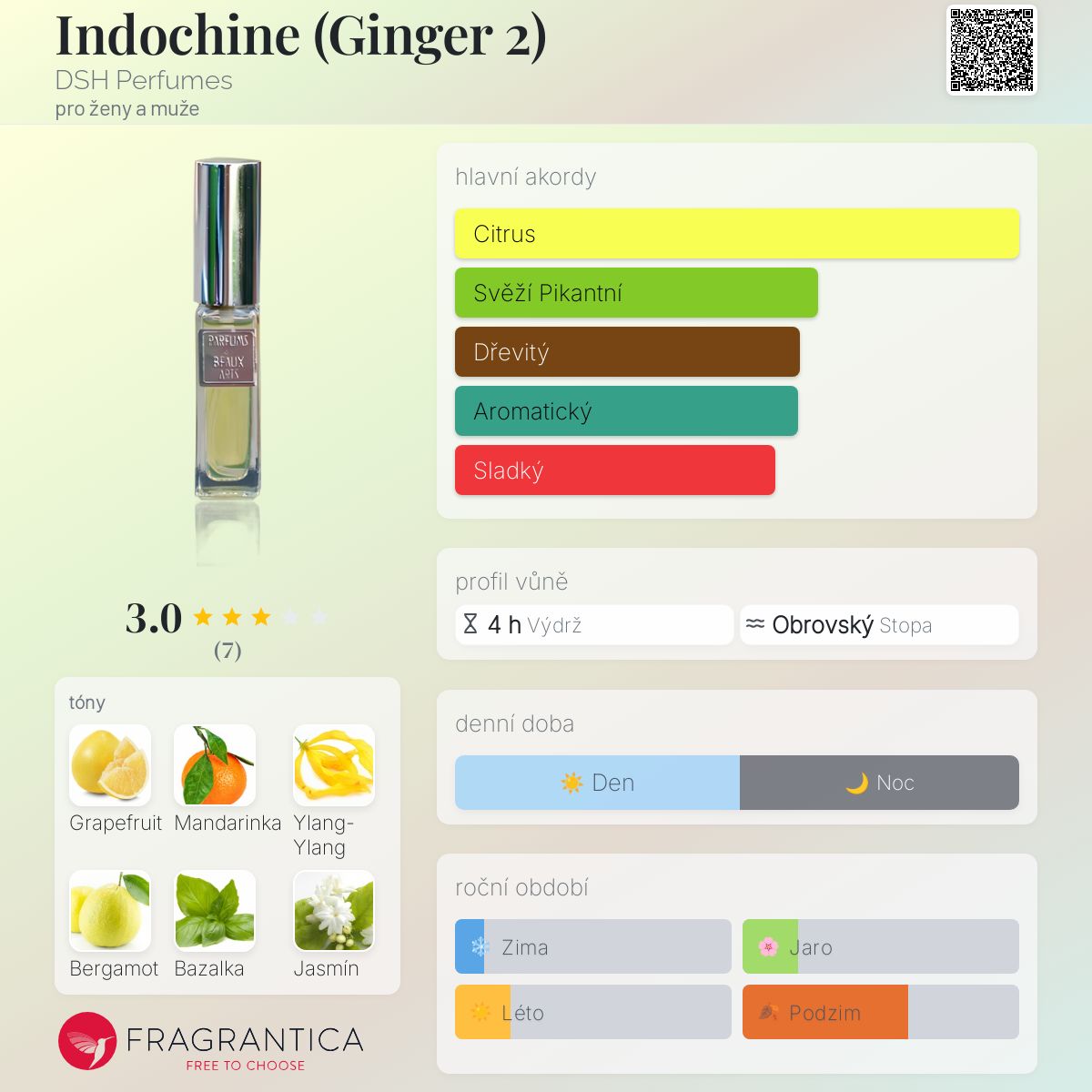 Indochine (Ginger 2) podle DSH Perfumes je vůně pro ženy a muže. "Nosem" za touto vůní je Dawn Spencer Hurwitz. Vrchní tóny jsou Grapefruit, Mandarinka, Bergamot, Bazalka, Citron amalfi , Petitgrain, Meduňka a Limetková kůra; střední tóny jsouYlang-Ylang, Jasmín, Zázvor, Bazalka a Brazilské růžové dřevo ; základní tóny jsou Pižmo, Santalové dřevo a Med.