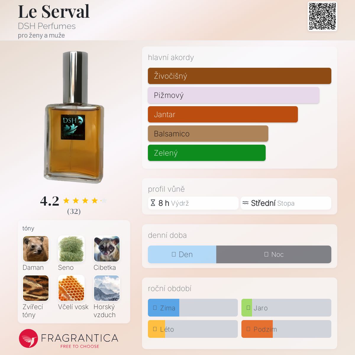 Le Serval podle DSH Perfumes je Orientální Woody vůně pro ženy a muže. Le Serval byl/a uveden/a v roce 2020. "Nosem" za touto vůní je Dawn Spencer Hurwitz.