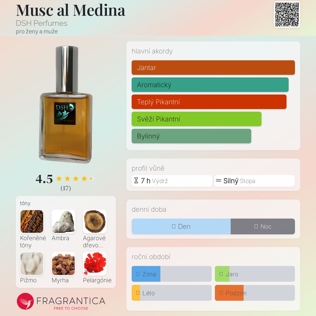 Musc al Medina podle DSH Perfumes je Aromatic vůně pro ženy a muže. Musc al Medina byl/a uveden/a v roce 2016. "Nosem" za touto vůní je Dawn Spencer Hurwitz.