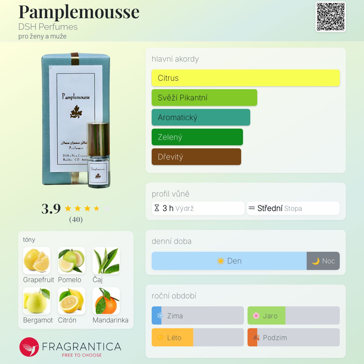 Pamplemousse podle DSH Perfumes je Citrus vůně pro ženy a muže. "Nosem" za touto vůní je Dawn Spencer Hurwitz. Vrchní tóny jsou Grapefruit, Bergamot a Mandarinka; střední tóny jsouPomelo, Citron amalfi a Neroli ; základní tóny jsou Čaj a Santalové dřevo.