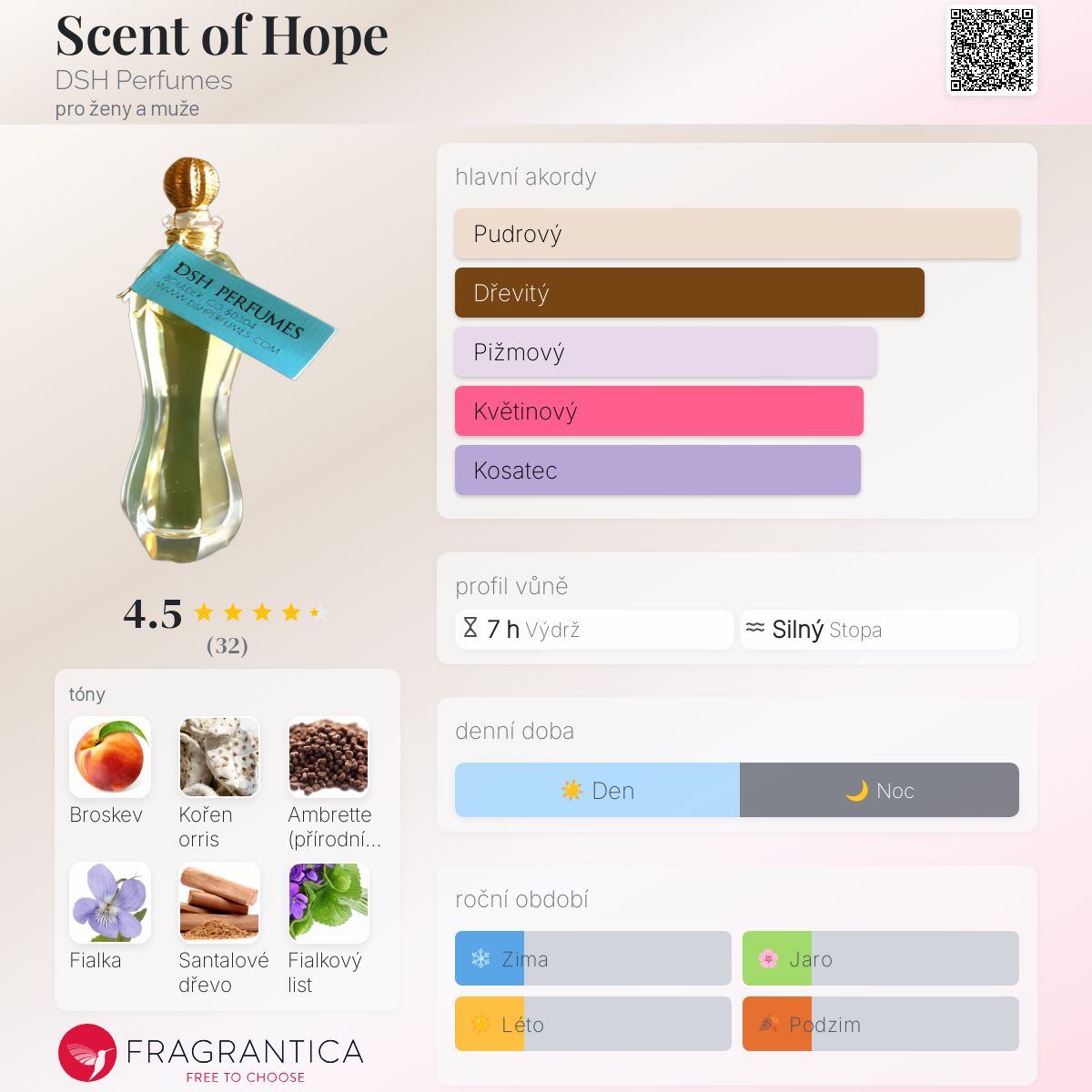 Scent of Hope podle DSH Perfumes je Floral vůně pro ženy a muže. Scent of Hope byl/a uveden/a v roce 2014. "Nosem" za touto vůní je Dawn Spencer Hurwitz.