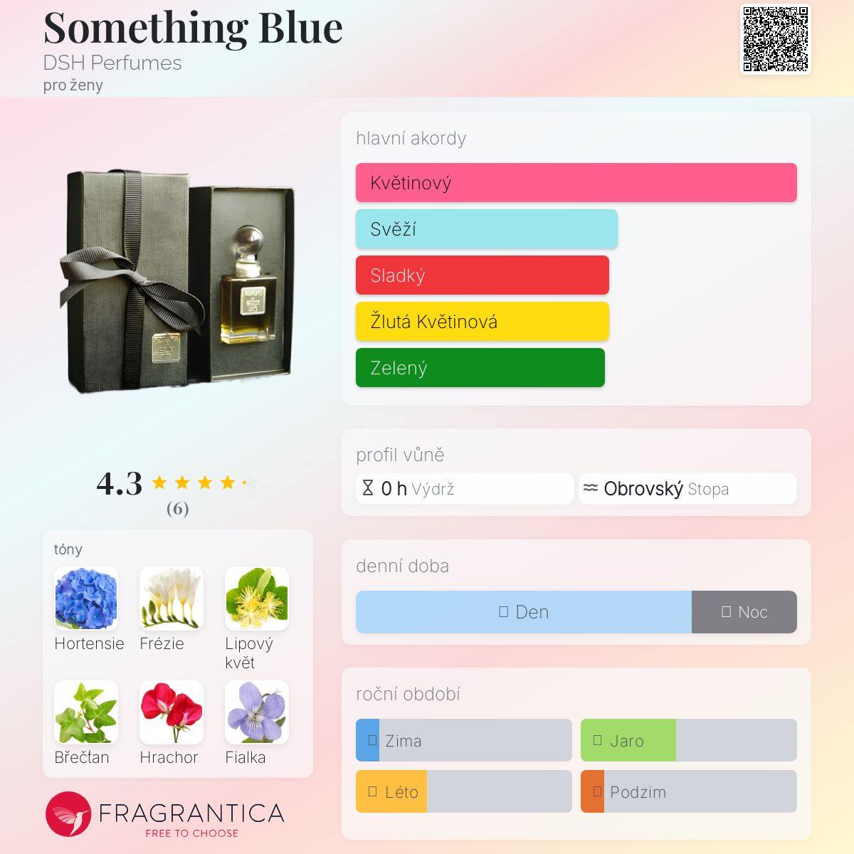 Something Blue podle DSH Perfumes je Floral vůně pro ženy. "Nosem" za touto vůní je Dawn Spencer Hurwitz. Vrchní tón je Hortensie ; střední tóny jsouFrézie, Lipový květ, Břečťan, Hrachor a Fialka ; základní tóny jsou Vetiver a Kosatec.