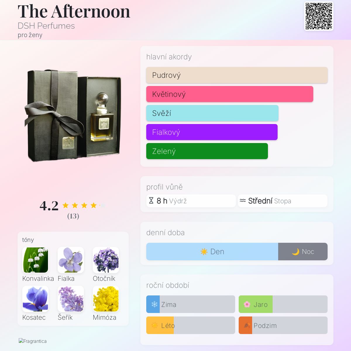 The Afternoon podle DSH Perfumes je Floral vůně pro ženy. "Nosem" za touto vůní je Dawn Spencer Hurwitz. Vrchní tóny jsou Fialka, Mimóza, Černý rybíz a Hrachor; střední tóny jsouKonvalinka, Otočník a Šeřík ; základní tóny jsou Kosatec a Santalové dřevo.