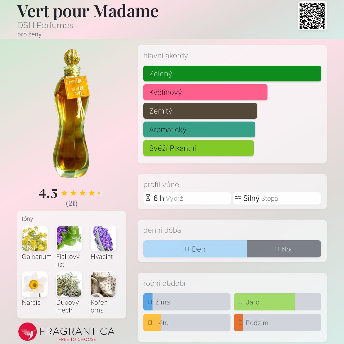 Vert pour Madame podle DSH Perfumes je Chypre Floral vůně pro ženy. "Nosem" za touto vůní je Dawn Spencer Hurwitz. Vrchní tóny jsou Galbanum, Fialkový list, Bergamot, Aldehydy, Bílá broskev a Poupata rybízu; střední tóny jsouHyacint, Narcis, Kořen orris, Marocká růže, Neroli, Ylang-Ylang, Konvalinka a Jasmín Sambac ; základní tóny jsou Mech, Labdanum, Cibetka, Fazole tonka, Atlasový cedr, Australské santalové dřevo, Virginský cedr, Indické pačuli a Pižmo.