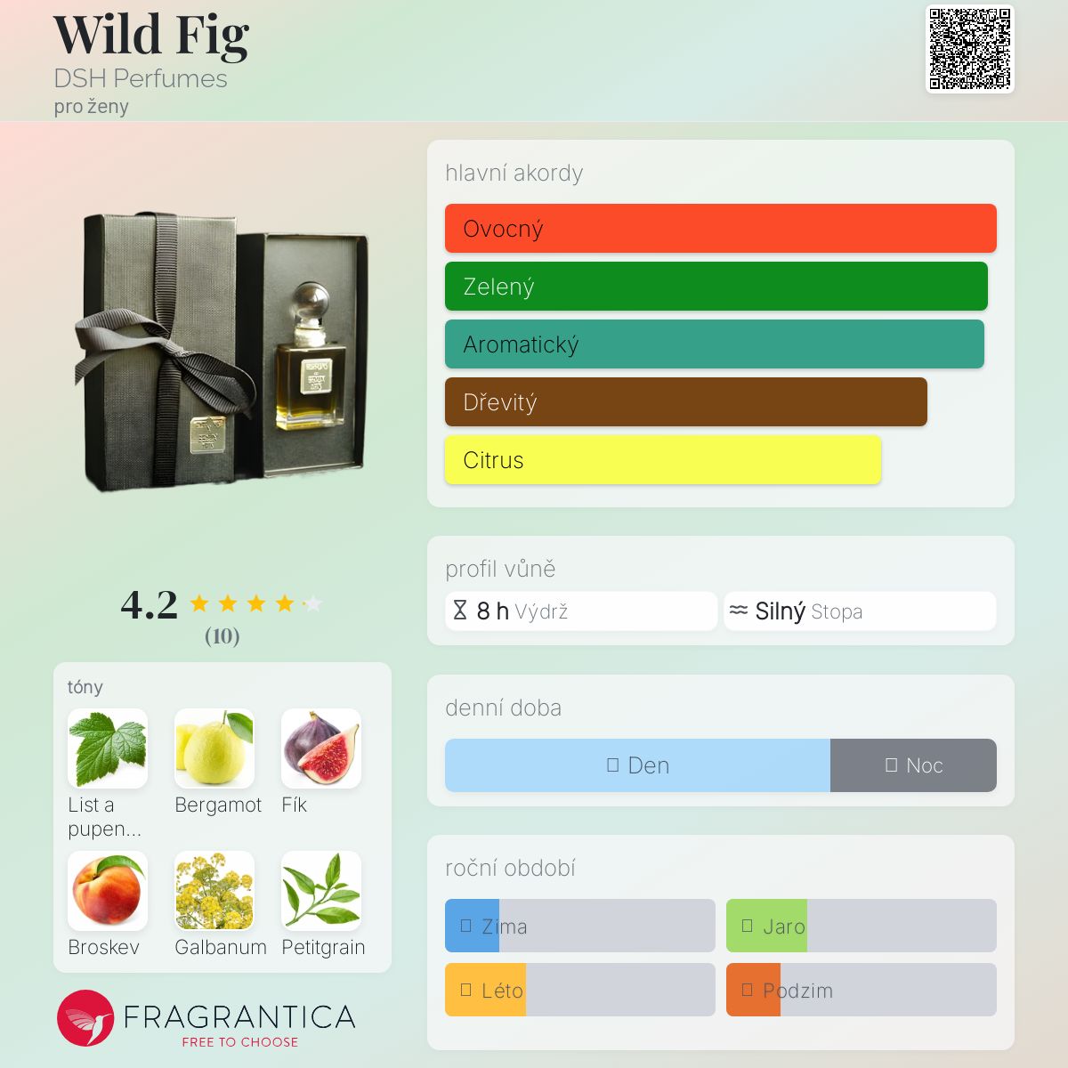 Wild Fig podle DSH Perfumes je Chypre Fruity vůně pro ženy. "Nosem" za touto vůní je Dawn Spencer Hurwitz. Vrchní tóny jsou Černý rybíz, Bergamot a Petitgrain; střední tóny jsouFík, Broskev a Konvalinka ; základní tóny jsou Galbanum, Virginský cedr, Dubový mech a Fazole tonka.
