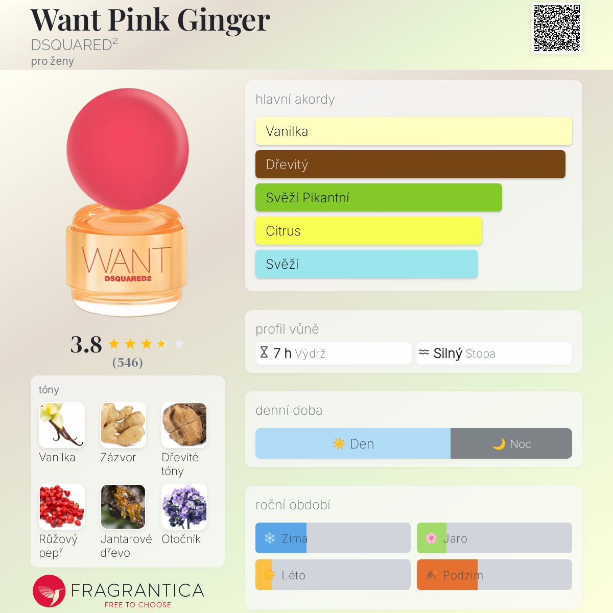 Want Pink Ginger podle DSQUARED² je Orientální Floral vůně pro ženy. Want Pink Ginger byl/a uveden/a v roce 2016. "Nosem" za touto vůní je Aurélien Guichard. Vrchní tóny jsou Zázvor, Růžový pepř, Mangostan, Mandarinka a Citrón; střední tóny jsouOtočník, Neroli a Damašská růže ; základní tóny jsou Vanilka, Madagaskarská vanilka, Dřevité tóny a Jantarové dřevo.