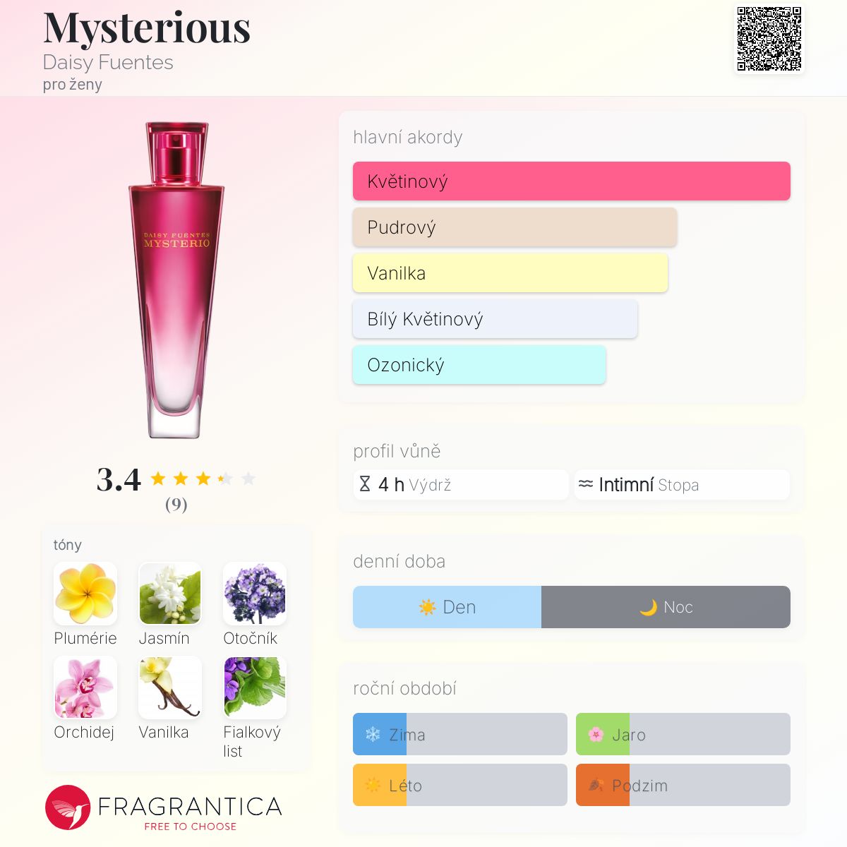 Mysterious podle Daisy Fuentes je Floral Fruity vůně pro ženy. Mysterious byl/a uveden/a v roce 2011. Vrchní tóny jsou Plumérie, Vonokvětka a Frézie; střední tóny jsouJasmín, Otočník, Orchidej a Lilie ; základní tóny jsou Vanilka, Fialkový list, Santalové dřevo, Pižmo a Ambrette (přírodní pižmo).
