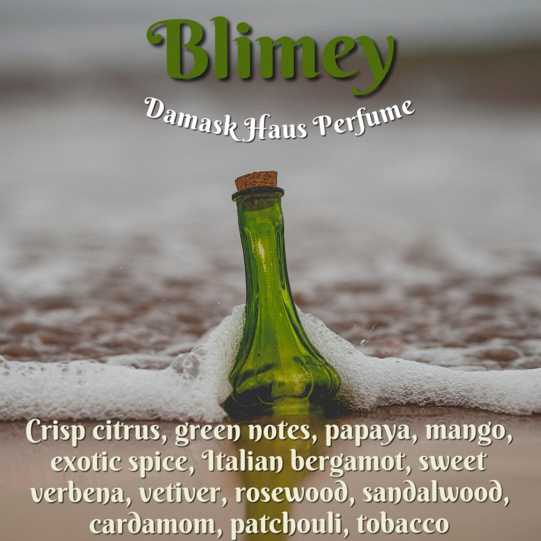 Blimey podle Damask Haus je Woody Aromatic vůně pro ženy a muže. Blimey byl/a uveden/a v roce 2021. "Nosem" za touto vůní je Bri Beyer. Vrchní tóny jsou Kardamom, Bergamot, Citrusy a Zelené tóny; střední tóny jsouPapája, Sporýš a Mango ; základní tóny jsou Palisandr, Vetiver, Tabák, Exotické koření, Santalové dřevo a Pačuli.